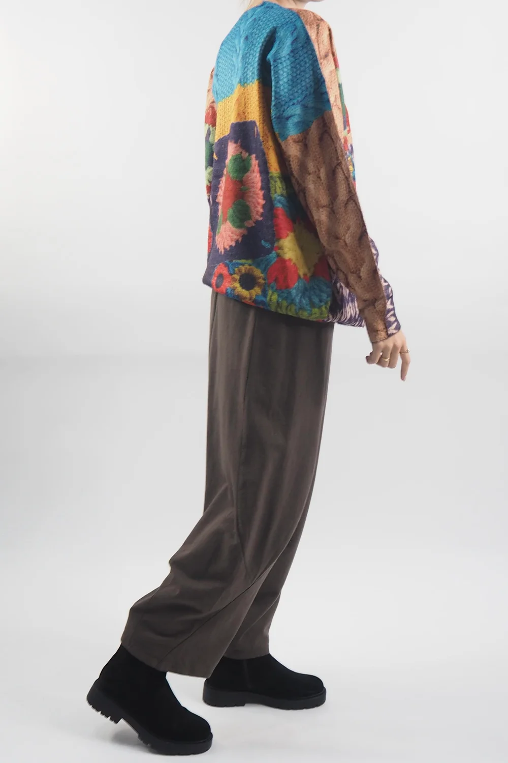 The Laundry B Folk Digital Soft Knit: our bold folk knit print knitwear piece is a must-have for all style-conscious individuals. This creative mix of chunky folk knit patchwork designs effortlessly combines the timelessness of knitwear with the digitally printed patchwork creativity of chunky knit. Crafted from a luxurious, super-soft fabric that feels like a warm embrace. Style with our Lagenlook cocoon trousers & Snug mini flatforms for a cosy, autumnal, relaxed look.