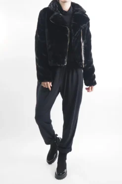 Indulge in the epitome of opulence with our latest obsession: the Laundry B Mara Teddy Biker in Black. This statement piece effortlessly combines edgy rebellion with extravagant refinement. Crafted from the silkiest, plush faux fur, it cocoons you in pure extravagance, delivering warmth and style in equal measure. Style with our Bodhi Slim Leg Trousers and Fine Jersey Polo Neck for the perfect autumn-winter look.