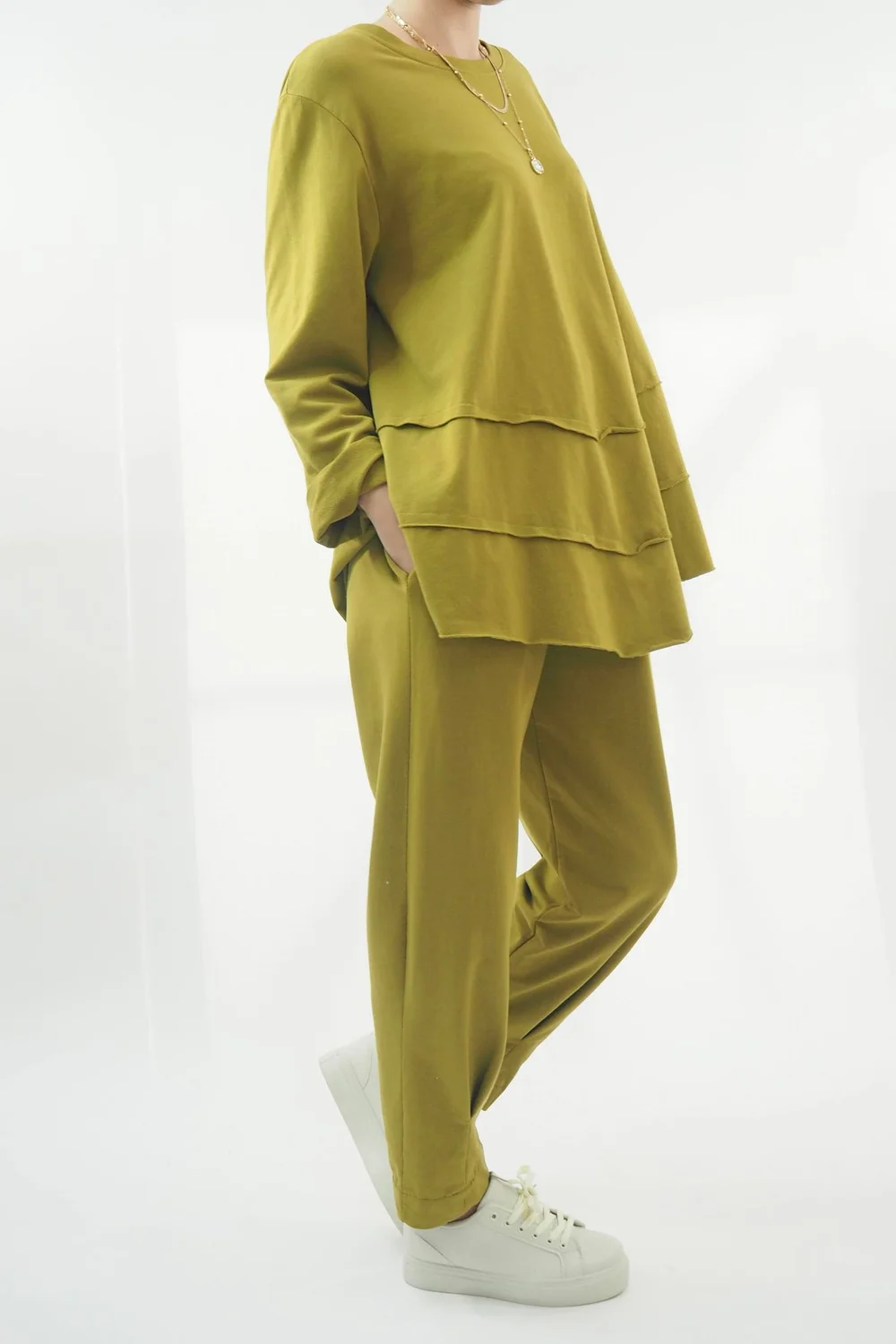 Introducing the epitome of effortless chic, to your wardrobe: our latest piece from Made in Italy clothing, the Made in Italy Apres Double V Raw Edge Top Oil, olive yellow green tone, a lightweight cotton stretch top that redefines comfort and style. Crafted with meticulous attention to detail, this top boasts a double v raw edge paneling that brings a touch of sophistication. The cleverly designed raw edge detail adds a unique dimension to the silhouette, elevating it from the ordinary to the extraordinary. Whether you’re lounging at home, running errands, or meeting up with friends, our Apres Double V Raw Edge Top effortlessly transitions from casual to chic, making them a must-have addition to your wardrobe.
