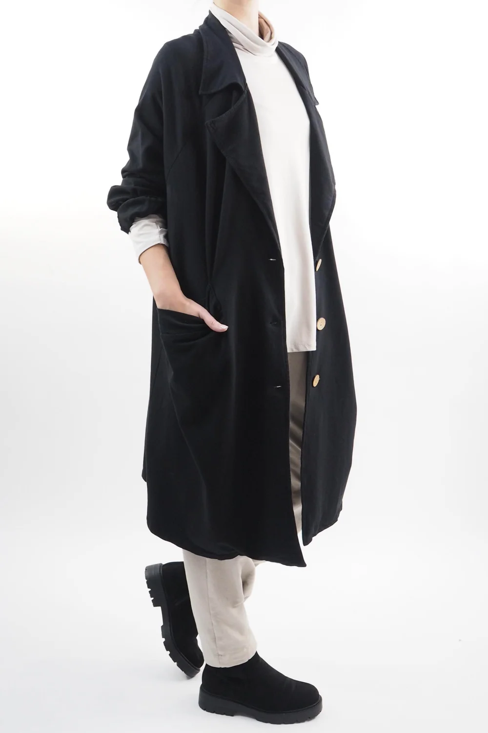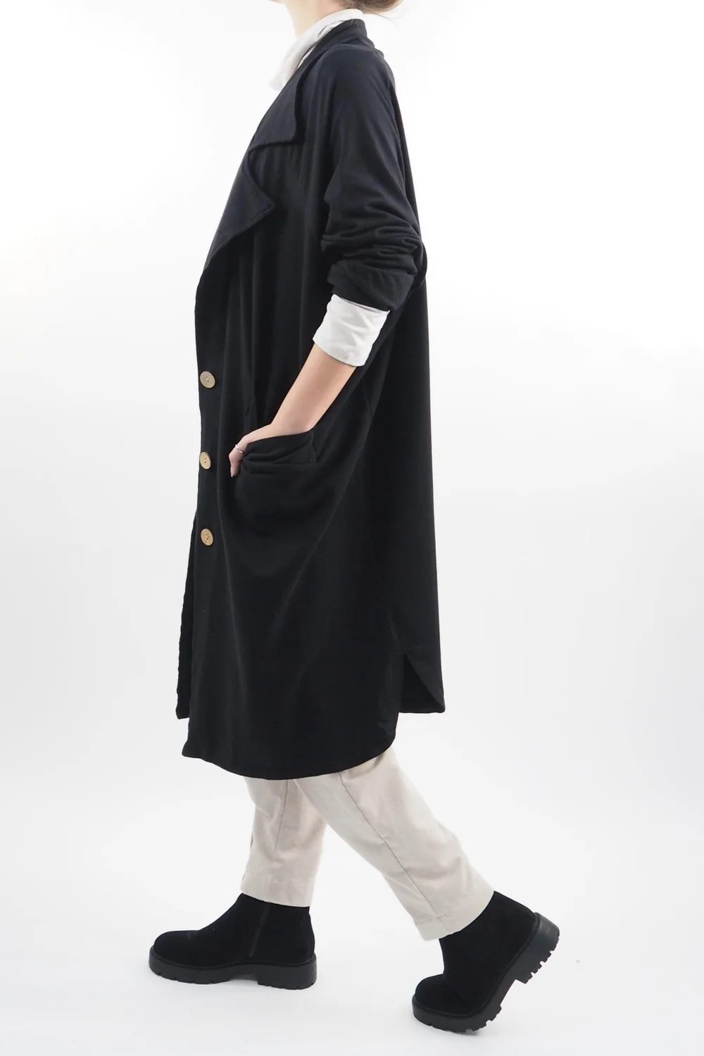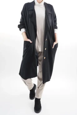 Embrace autumn with our Made in Italy Apres Longline Relaxed Blazer Black – the perfect jacket for those crisp, golden-hued mornings. Made with meticulous artistry, this jacket seamlessly blends style and comfort, offering a warm embrace as you step into the season. The soft cotton fabric exudes rustic charm, while the tailored cut ensures a flattering silhouette. With its versatile design, this jacket effortlessly accompanies both casual denim and tailored trousers, making it a must-have for your fall wardrobe.Â
