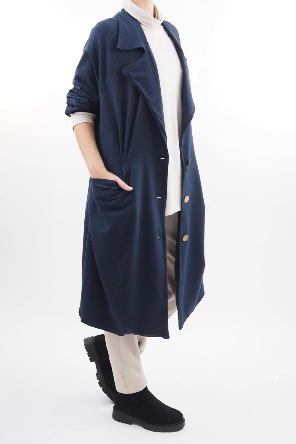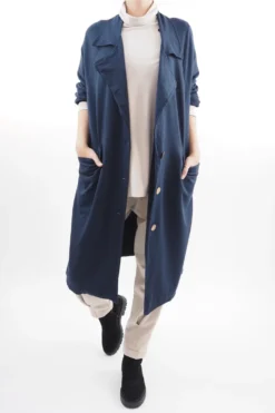 Embrace autumn with our Made in Italy Apres Longline Relaxed Blazer Navy – the perfect jacket for those crisp, golden-hued mornings. Made with meticulous artistry, this jacket seamlessly blends style and comfort, offering a warm embrace as you step into the season. The soft cotton fabric exudes rustic charm, while the tailored cut ensures a flattering silhouette. With its versatile design, this jacket effortlessly accompanies both casual denim and tailored trousers, making it a must-have for your fall wardrobe.Â