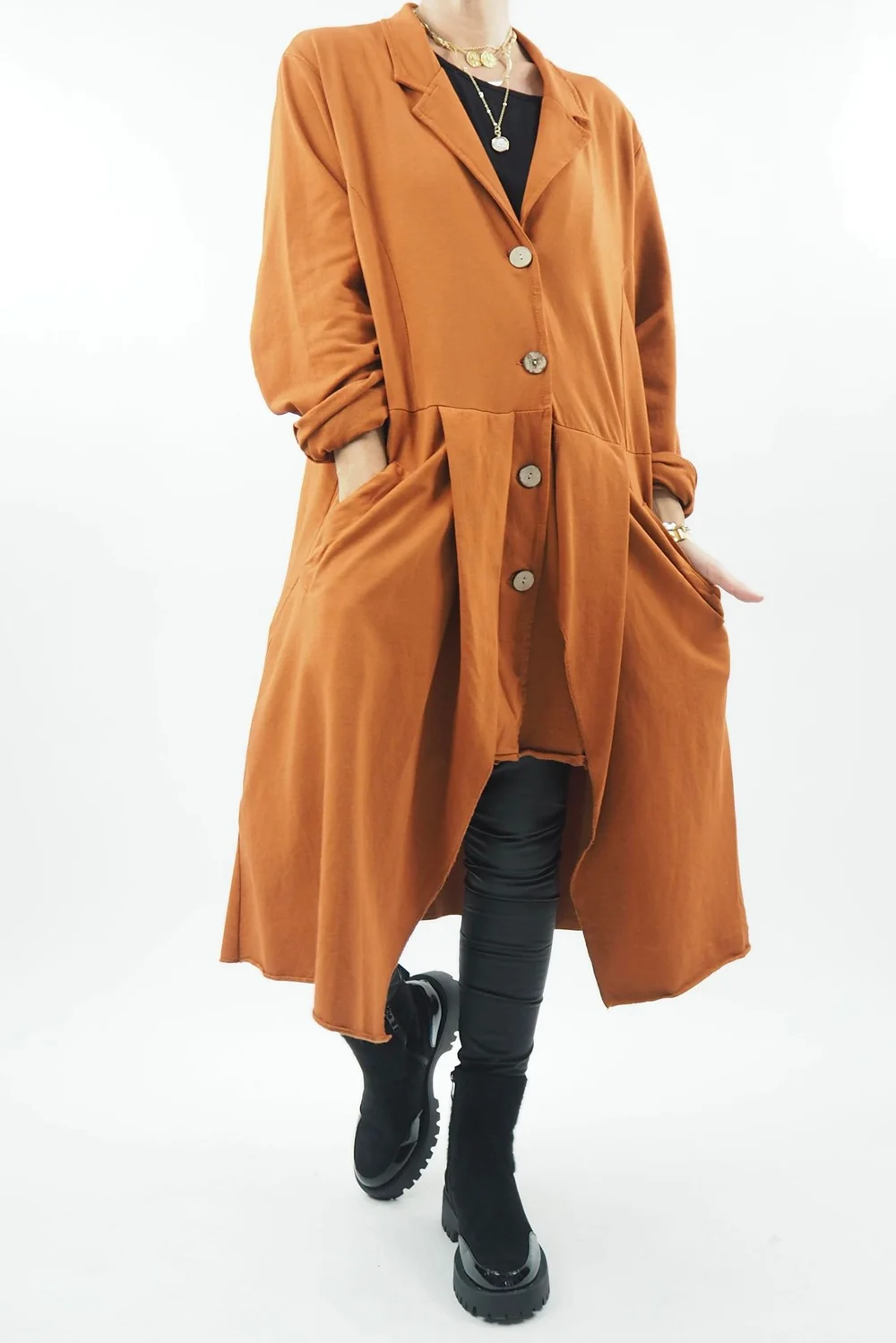Embrace the enchanting aura of autumn with our Made in Italy Apres Morning Jacket Saffron orange tone – the quintessential outerwear for those crisp, golden-hued mornings. Made with meticulous artistry, this jacket seamlessly blends comfort and style, offering a warm embrace as you step into the season. The soft  fabric exudes rustic charm, while the tailored cut ensures a flattering silhouette. With its versatile design, this morning jacket effortlessly accompanies both casual denim and tailored trousers, making it a must-have for your fall wardrobe.