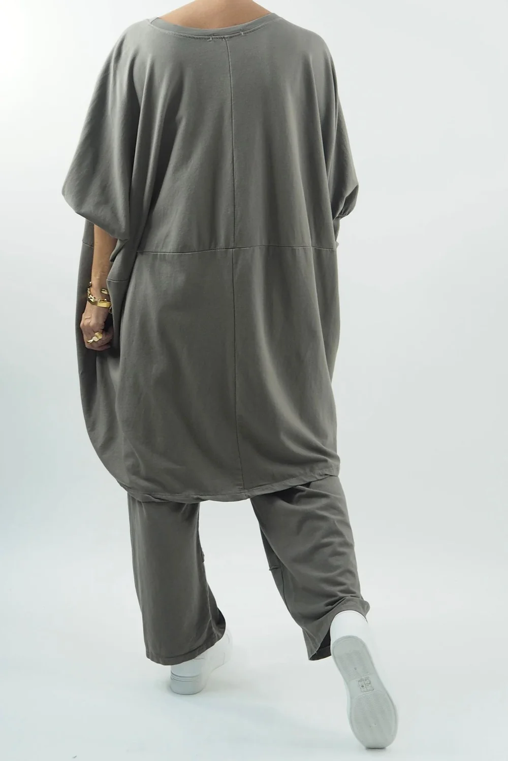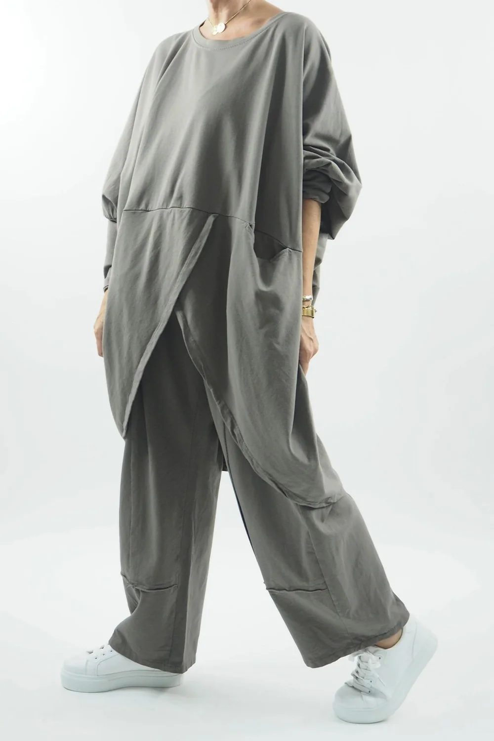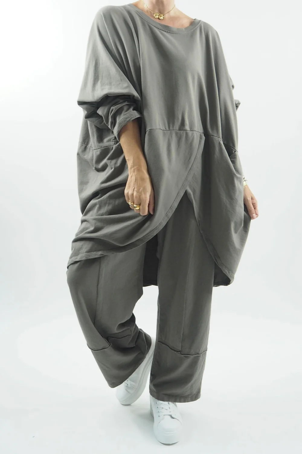 The epitome of functionality: the Made in Italy Apres Super Swag Sweatshirt in Mushroom brown grey tone has hidden pockets, where style seamlessly meets practicality. This piece transcends fashion norms, featuring a swag scalloped edge perfect for lagenlook layering with other pieces from our Apres Collection, exuding an air of graceful sophistication. The pockets, cleverly concealed within the fabric, provide an element of surprise, ensuring your essentials remain close at hand without compromising the top’s streamlined allure.
