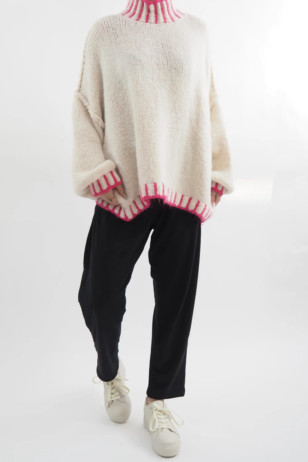 Get ready to cosy up in style this season with the new Made in Italy Arlo Oversized Blanket Stitch Knit Top in a mixture of Ecru, Cream and Hot Pink tones. This chic and comfortable knit is taking the fashion world by storm, with its contrasting cuff and neckline adorned with chunky blanket stitch detailing, adding a touch of artisanal craftsmanship to your wardrobe. The oversized silhouette not only embraces the essence of laid-back luxury but also keeps you snug and stylish during those crisp autumn days and chilly winter nights. It’s the perfect embodiment of relaxed sophistication, ensuring you’ll turn heads wherever you go. So, indulge in warmth and fashion this year by making this exquisite piece your go-to choice for effortless elegance.