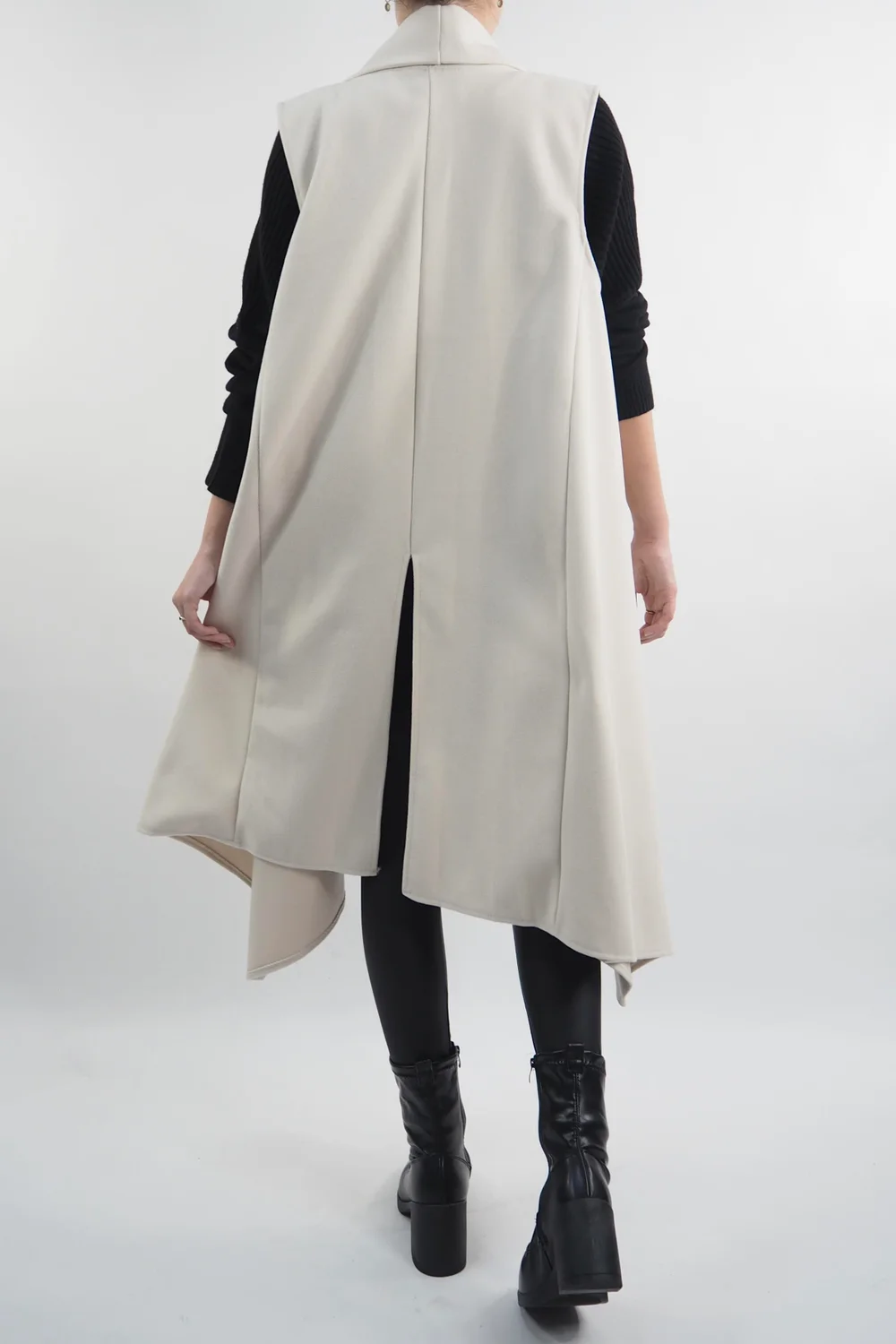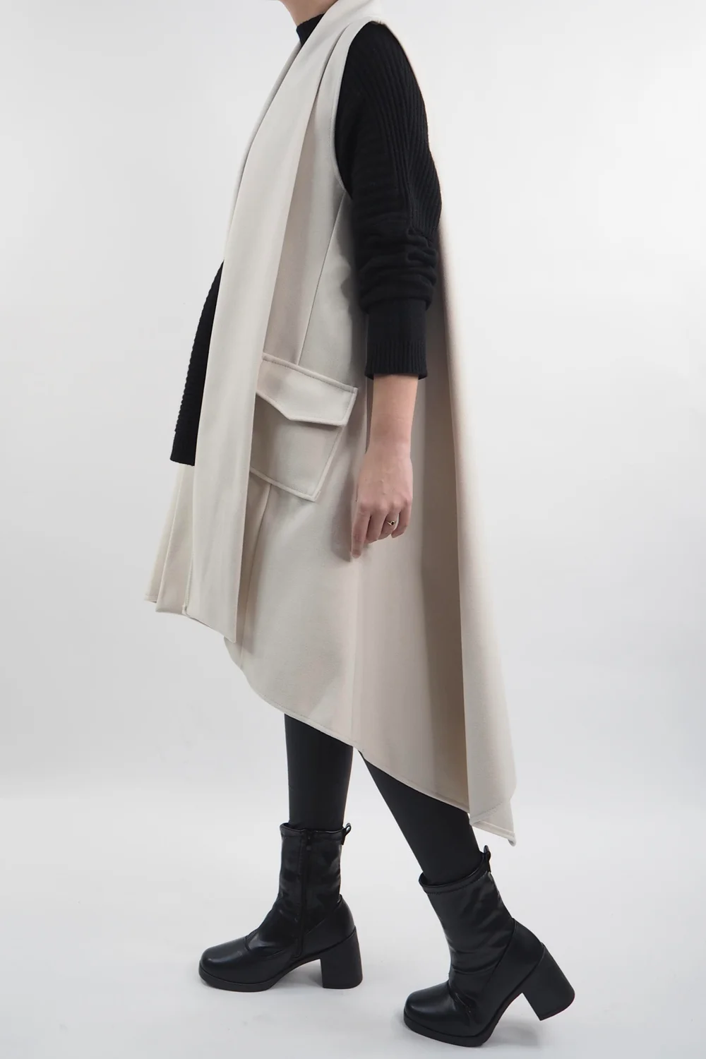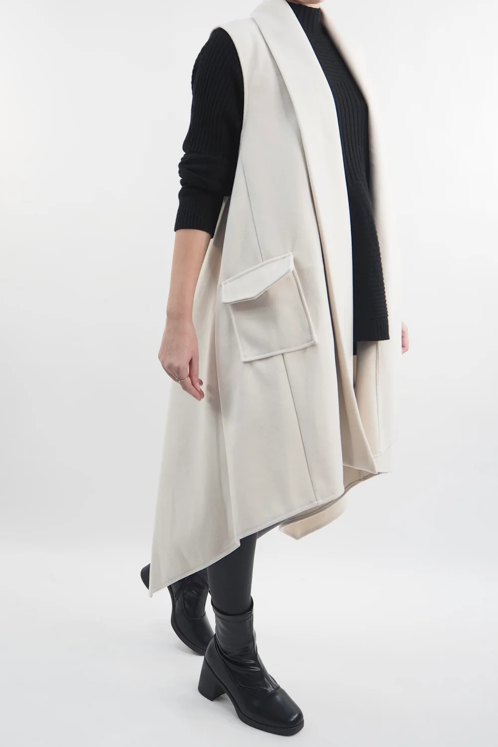 Introducing the epitome of timeless elegance, our Made in Italy Belgravia Weekend Gilet in Stone, beige tone, this classic, longline, trapeze shape gilet is a must-have addition to your wardrobe. Its elongated silhouette not only flatters all body types but also provides ample coverage, making it the perfect choice for layering. Whether you’re aiming for a chic and polished ensemble, styled with our Pesca leather-look leggings or opting for a more relaxed, athleisure-inspired look, this gilet proves its adaptability as a fashion essential.Â