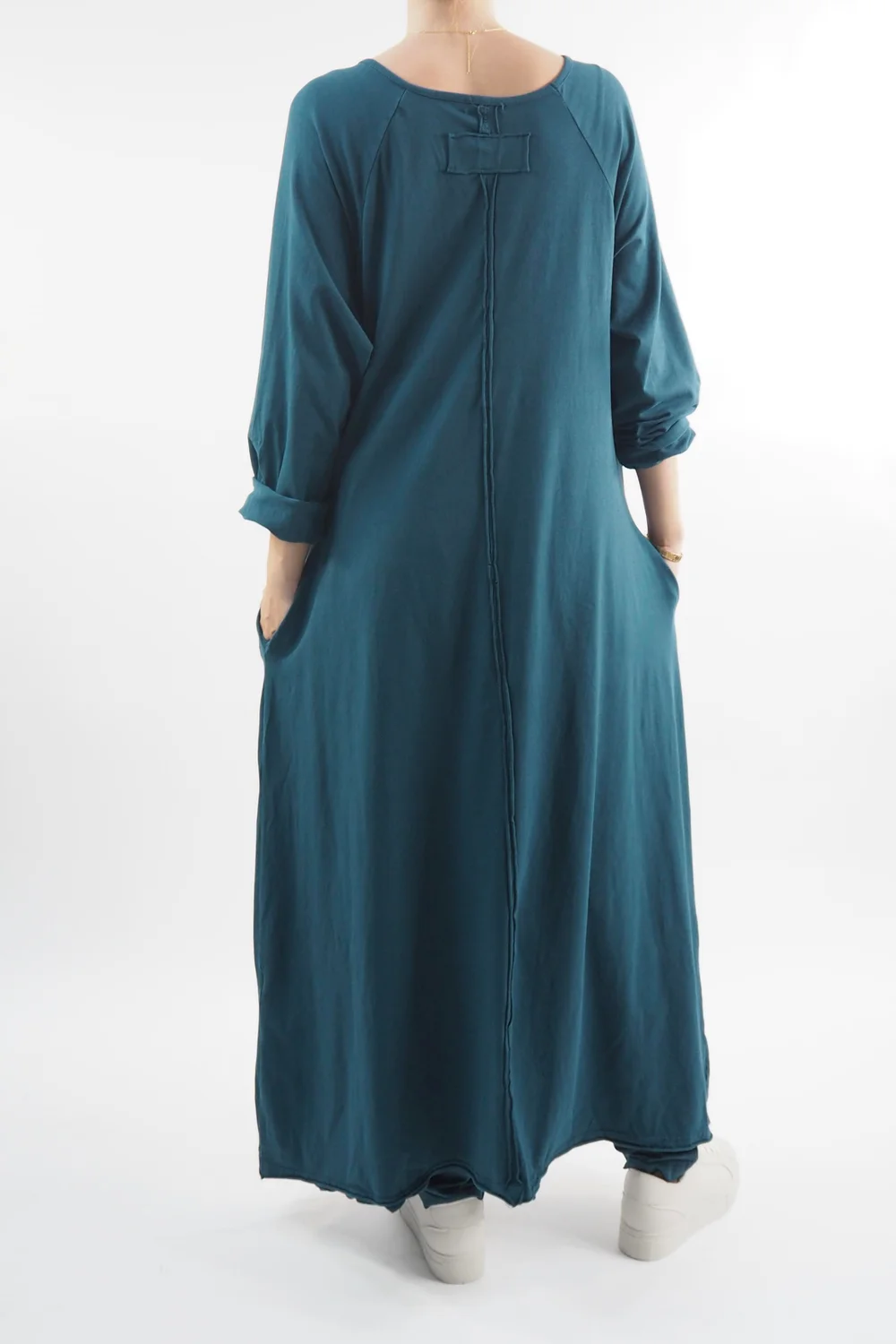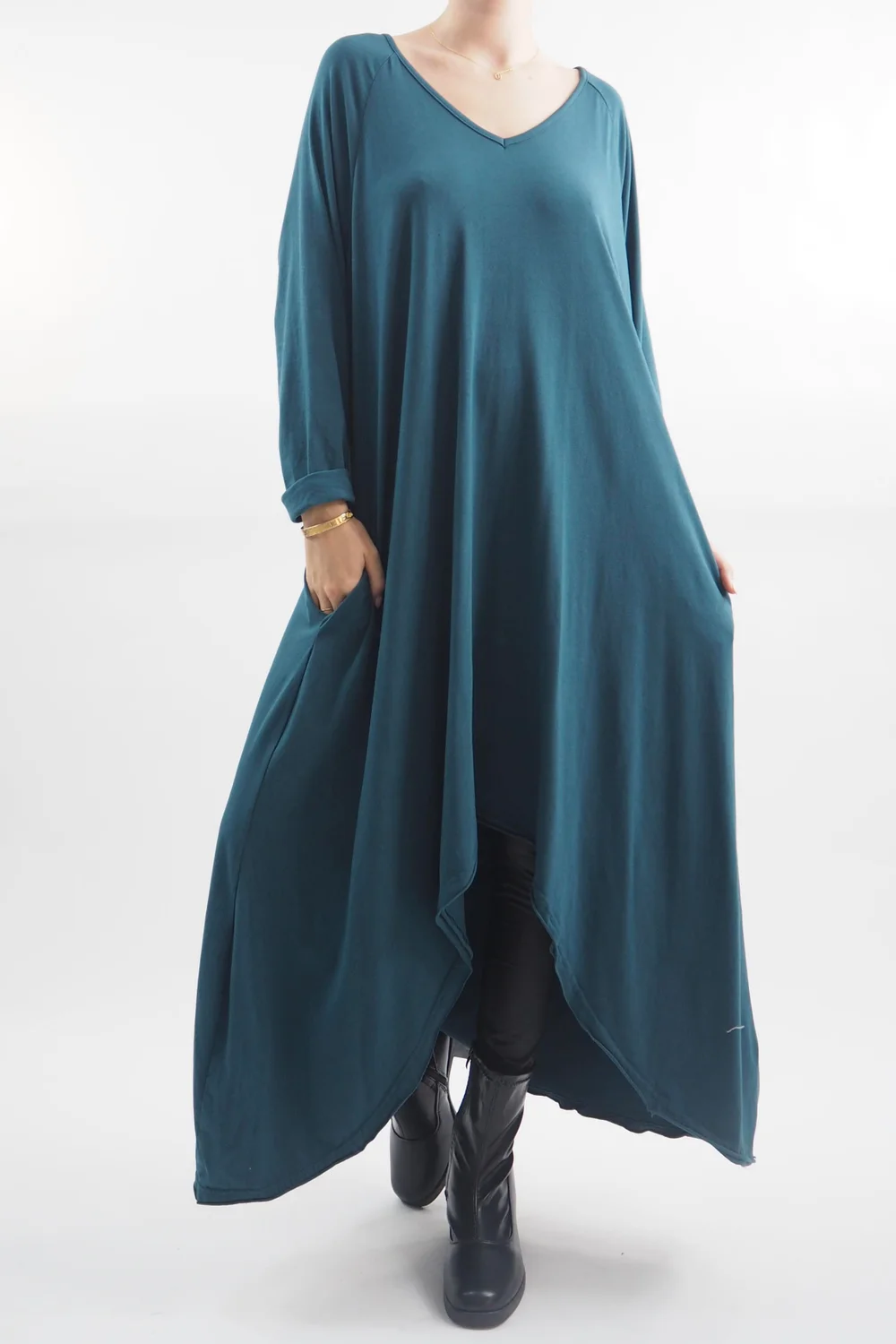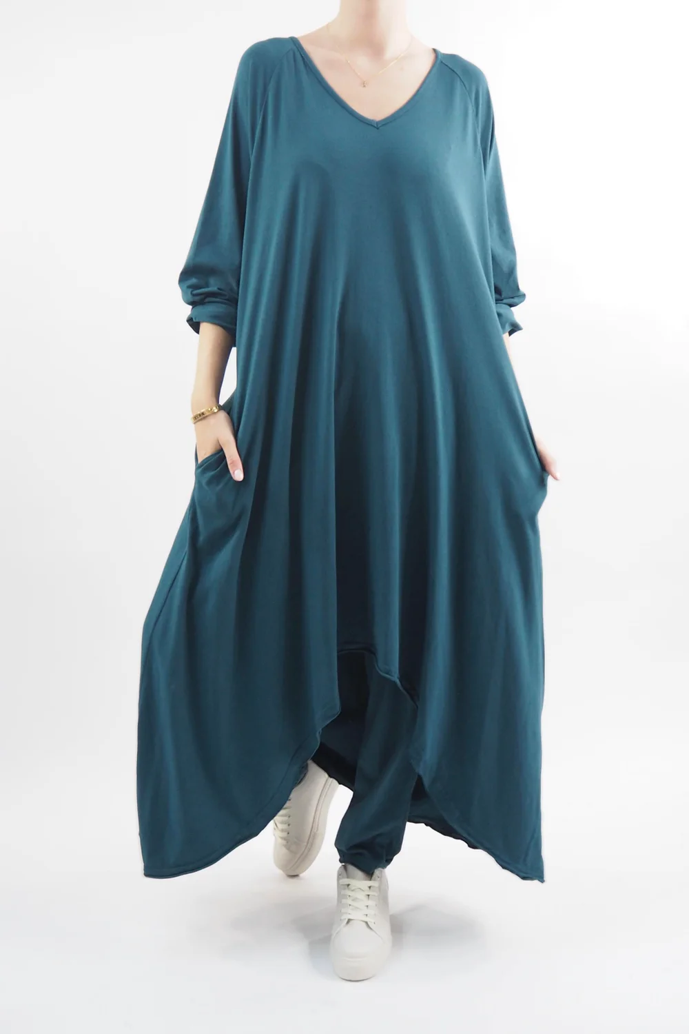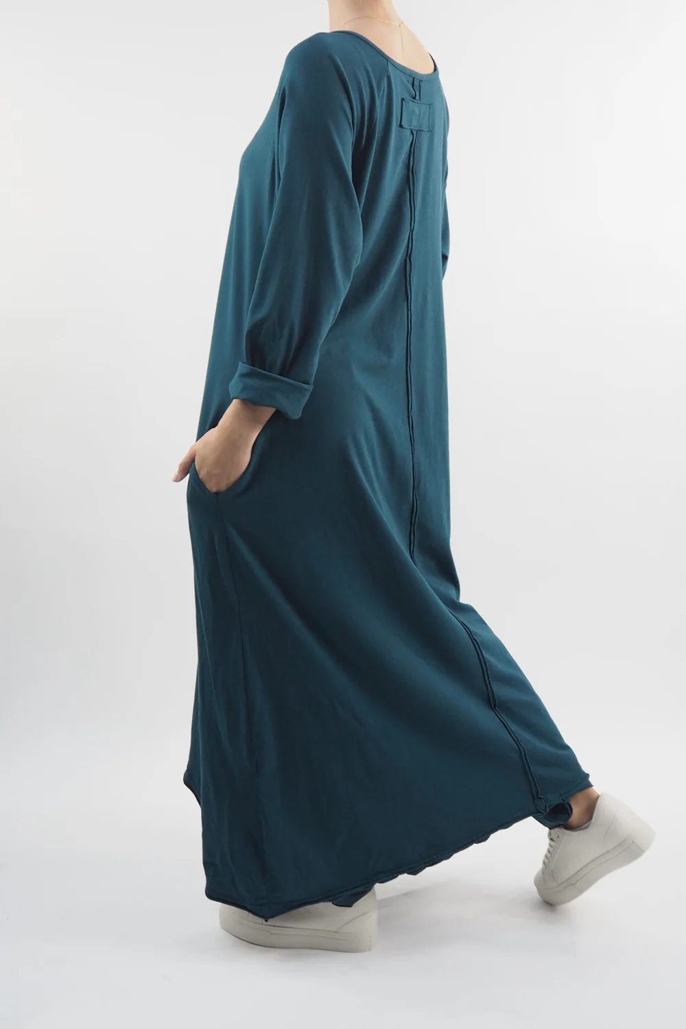 The Made in Italy Bodhi Archie Dress in Dark Lagoon, teal blue green tone, embodies effortless sophistication with its exquisite design elements. The front archie hemline detail adds a touch of intrigue to the classic dress silhouette, creating a focal point that’s both flattering and chic. Its practicality is elevated by the inclusion of pockets, seamlessly blending style and convenience. Style with our Made in Italy Bodhi Slim Leg Pants, it’s the perfect lagenlook layering piece.