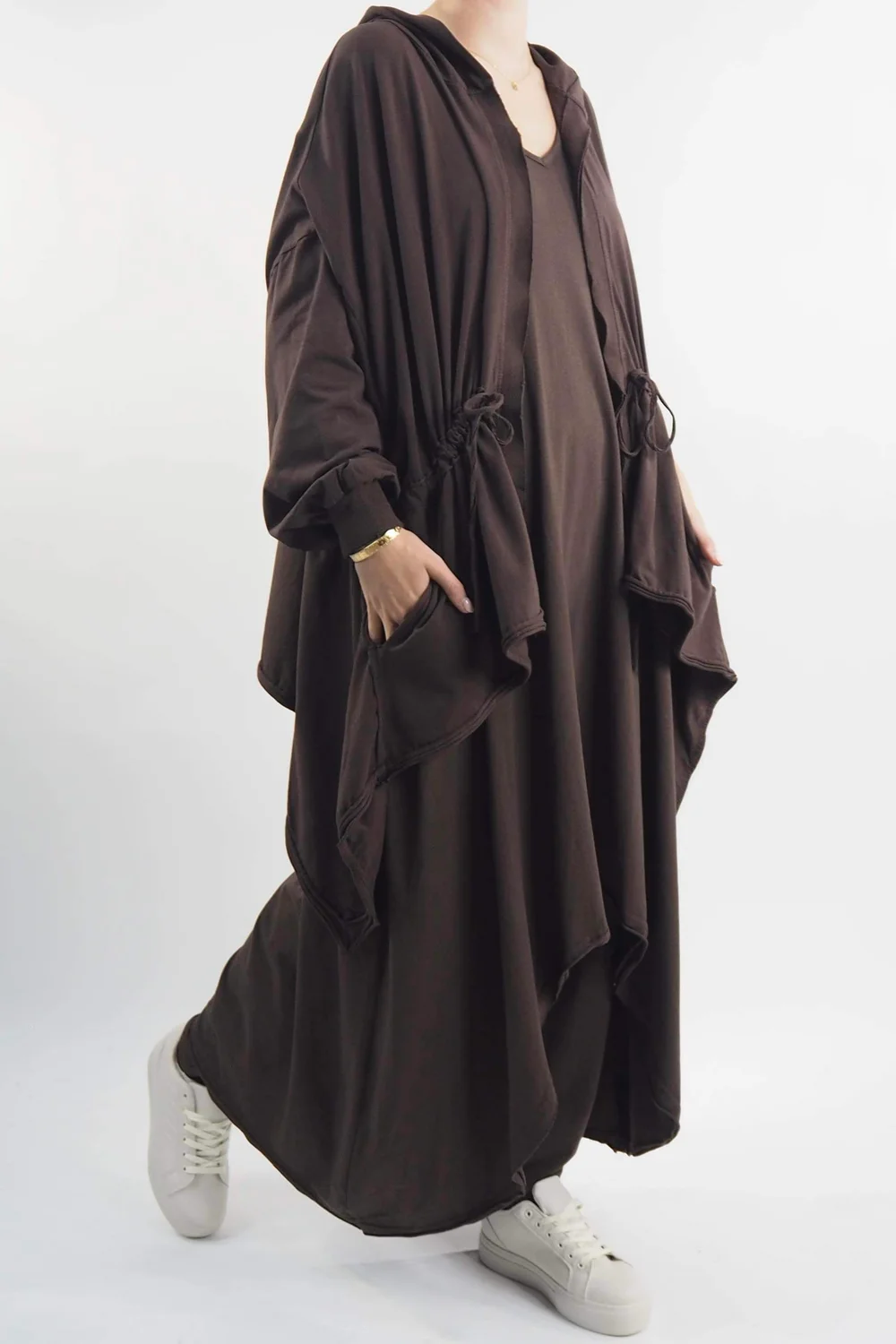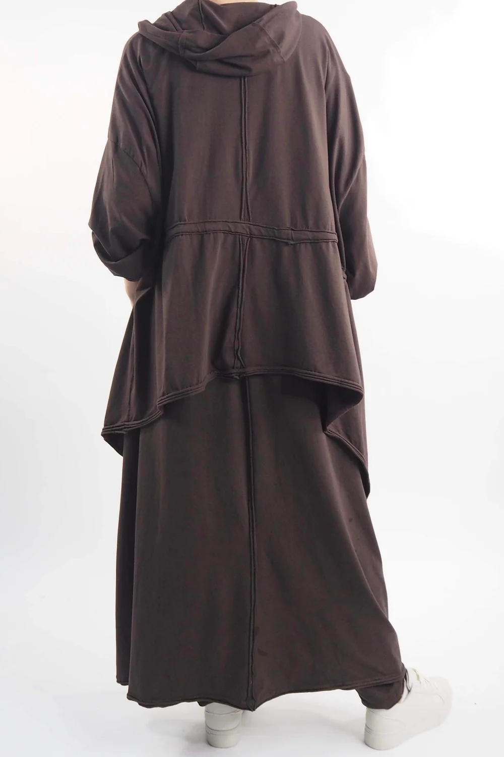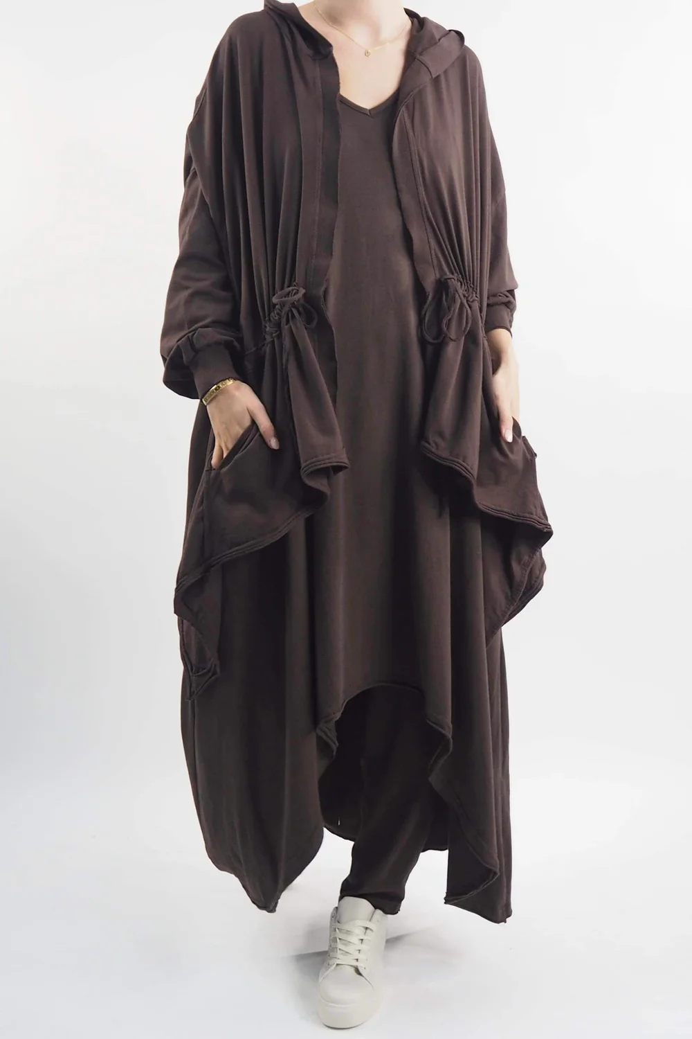 Introducing the ultimate must-have for this season’s wardrobe: our Made in Italy Bodhi Goody Hoodie in Classic Umber, dark brown, a super cool, seam detail, cinch waist hoodie crafted in a lightweight stretch cotton that effortlessly blends style and comfort. Style with our Made in Italy Bodhi Archie Dress & Bodhi Slim Leg Pants for the perfect Lagenlook look.