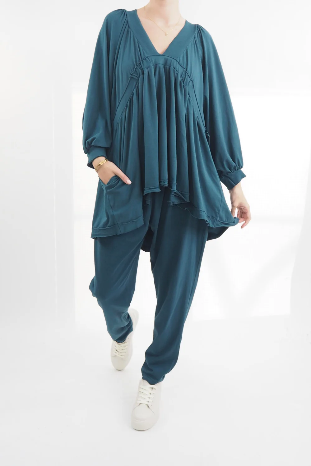 The Made in Italy Bodhi Rock The Smock Top in Dark Lagoon, blue teal tone : The epitome of effortless elegance: our latest creation, a gorgeous, lightweight smock top crafted from the finest stretch cotton. This versatile piece seamlessly marries comfort and style, making it a must-have addition to your wardrobe. The lightweight, breathable fabric drapes gracefully, providing a flattering silhouette for all body types. Its enchanting design features an adjustable cinch waist, allowing you to customize the fit to your preference, ensuring a perfect and comfortable look every time. Style with our Made in Italy Bodhi Slim Leg Pants for the perfect look. Embrace the beauty of comfort and style with this exquisite piece that will become your new go-to for any occasion.