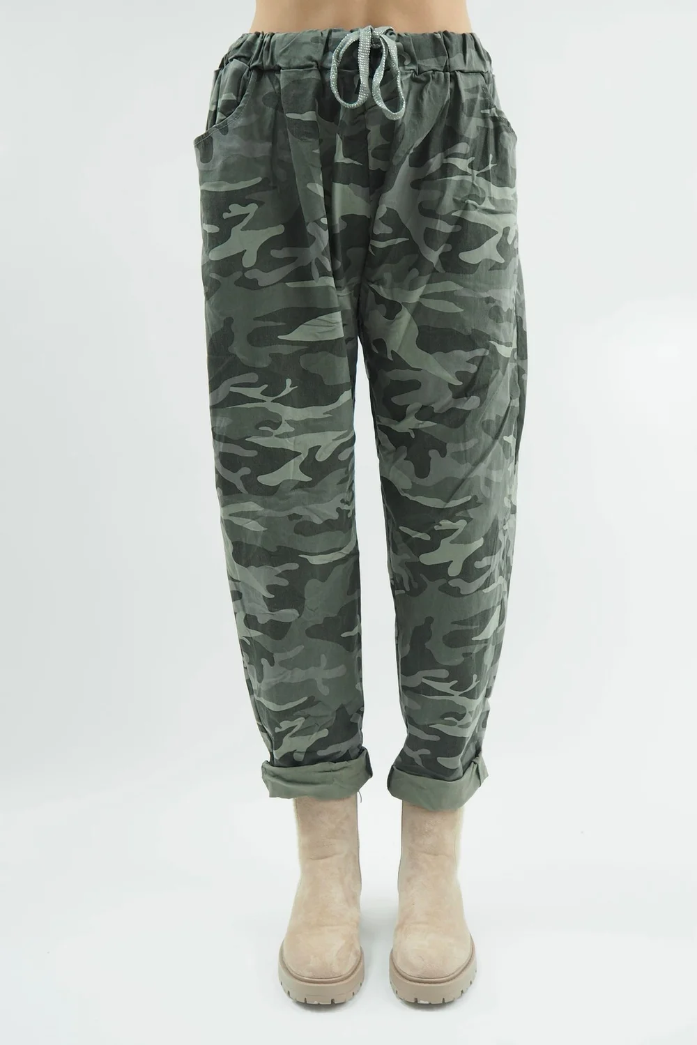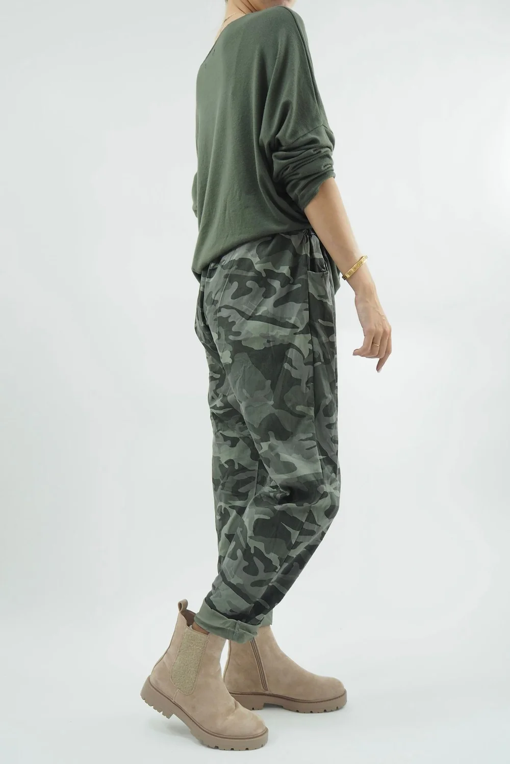 Introducing the epitome of effortless, edgy style and comfort : our Made in Italy Camo Classic Magic Trousers in classic Khaki, green tones. These extraordinary trousers are a game-changer, seamlessly blending unparalleled comfort and timeless elegance. Our Made in Italy Camo Classic Magic Trousers possess a remarkable elasticity that adapts to your every move, making them a dream to wear throughout the day and night.