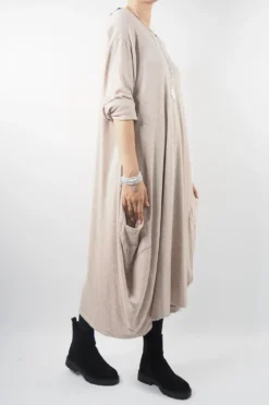 Introducing the epitome of elegance and comfort: the Chalet Classic Cocoon Knit Dress in Oatmeal, beige tone, from Made in Italy Clothing. A true wardrobe essential, this one-size-fits-all marvel is the perfect piece, regardless of your body shape. Crafted with the utmost precision, this ethereal creation boasts a lightweight design that lends itself perfectly to the art of layering. A piece that promises to be your trusty companion for every season, this cocoon dress is a seamless fusion of comfort and style. Style with tights and boots for the perfect look.