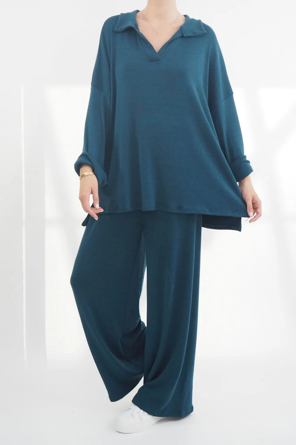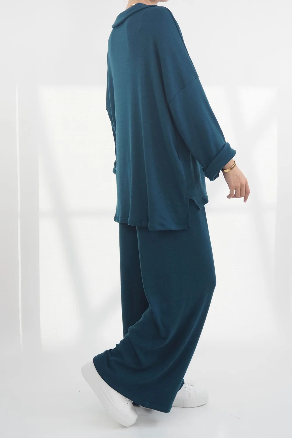 Indulge in the ultimate comfort and style with our super soft, relaxed, and oh-so-cosy set: the Chalet Collared Soft Knit Set in Prussian green blue tone, from Made in Italy Clothing, crafted for those moments of everyday relaxation, this set is a must-have for your autumn wardrobe. The wide-leg, knit trousers boast an elastic waistband, ensuring a perfect fit while allowing you to move with ease. Paired with a matching knit collared top, this ensemble effortlessly combines style and comfort.