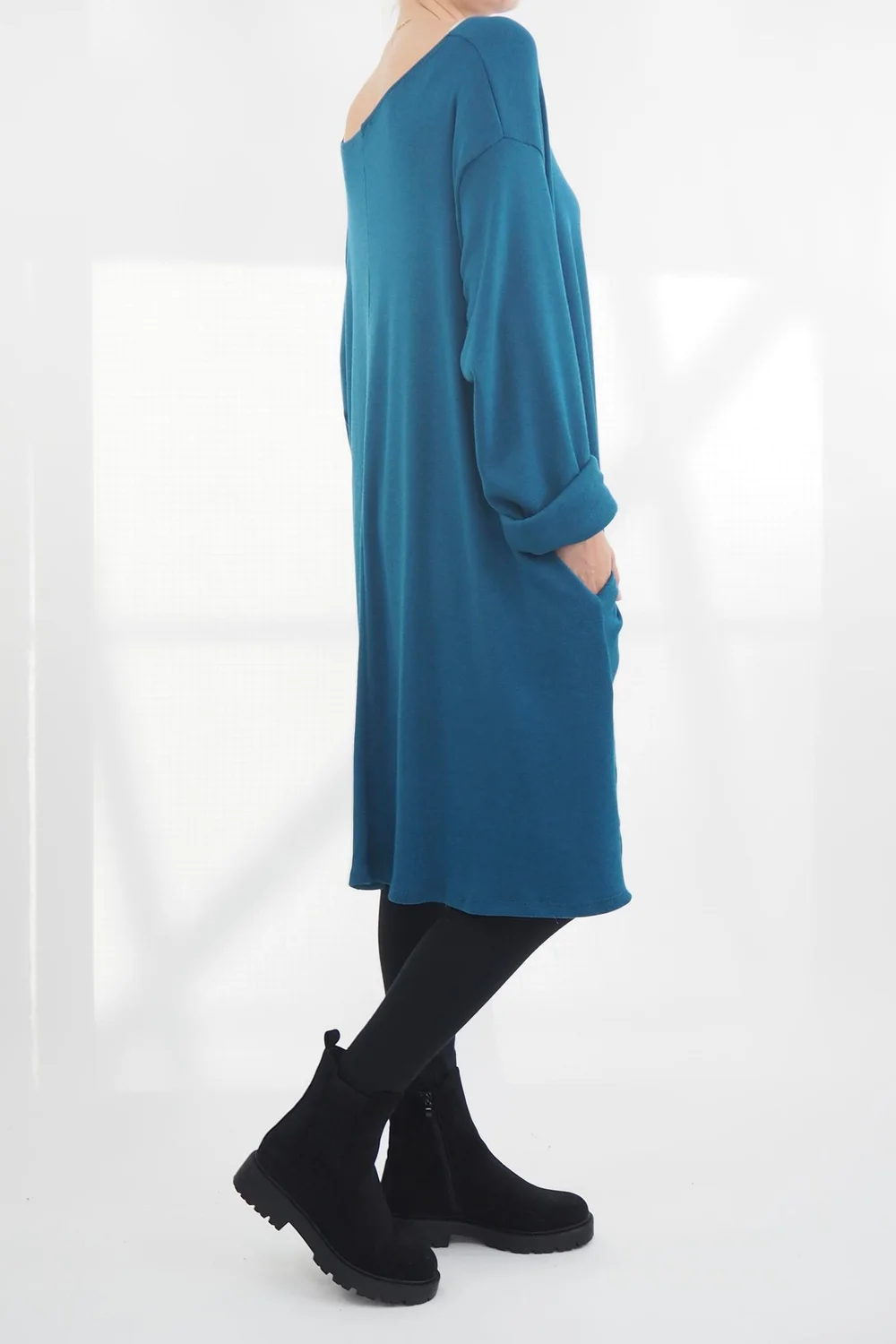 Indulge in the ultimate comfort and style with our super soft, relaxed, and oh-so-cosy: Chalet Pocketed Swing Soft Knit Dress in Prussian green blue tone, from Made in Italy Clothing, crafted for those moments of everyday relaxation, this set is a must-have for your autumn wardrobe. The swing dress shape flatters all shapes and sizes while allowing you to move with ease. Did I mention it has pockets! Paired with cosy leggings and boots for the perfect autumn look, this ensemble effortlessly combines style and comfort.