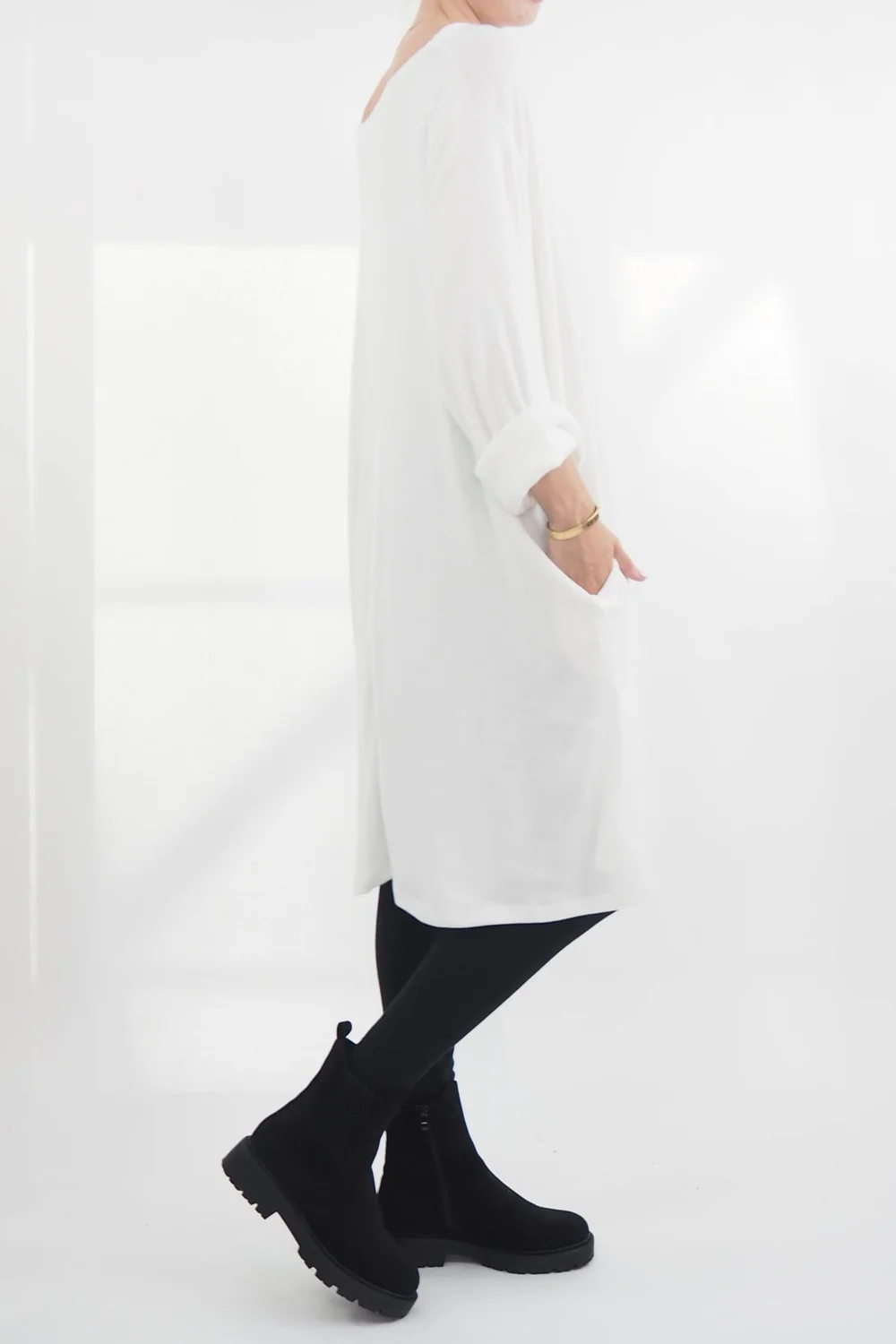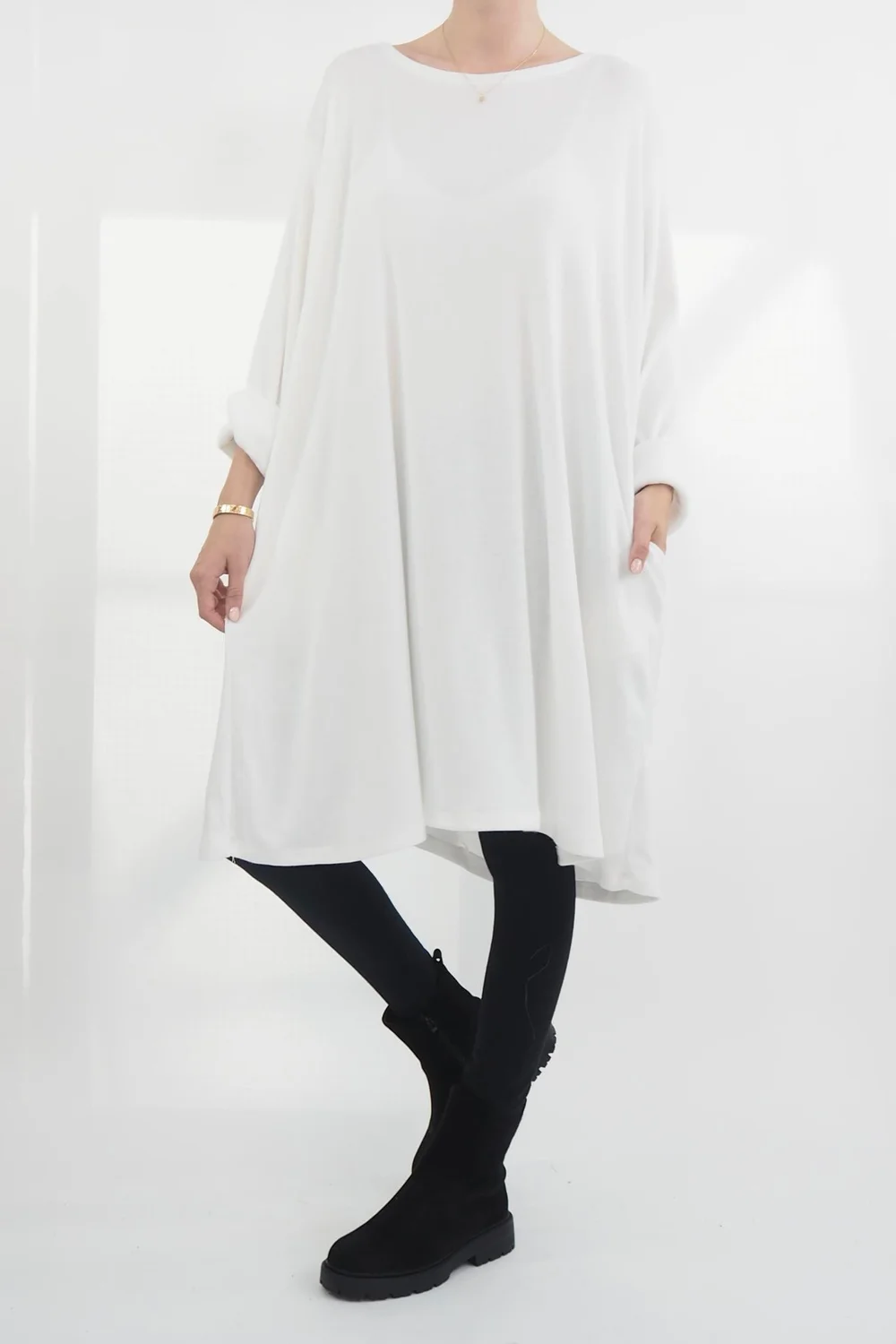 Indulge in the ultimate comfort and style with our super soft, relaxed, and oh-so-cosy: Chalet Pocketed Swing Soft Knit Dress in Winter White tone, from Made in Italy Clothing, crafted for those moments of everyday relaxation, this set is a must-have for your autumn wardrobe. The swing dress shape flatters all shapes and sizes while allowing you to move with ease. Did I mention it has pockets! Paired with cosy leggings and boots for the perfect autumn look, this ensemble effortlessly combines style and comfort.