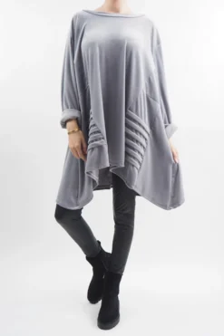 Luxurious comfort this autumn with our Made in Italy Chalet Vente Top in Storm, grey tone, adorned with exquisite pleat details that elevate loungewear to the height of fashion. Crafted for the connoisseur of relaxation, this top caresses the skin in the softest velour, promising unparalleled cosiness during the crisp fall evenings. The meticulous pleating adds a touch of sophistication, transforming this casual piece into a statement of effortless elegance. Whether you’re unwinding at home or savouring a leisurely stroll through autumn leaves, this velour masterpiece is your go-to choice. Pair it with your favourite denim or cosy leggings, and relish in the blend of comfort and style. Embrace the season in true fashion, wrapped in the luxury of velour and the artistry of pleats, for a tranquil autumnal experience like no other.