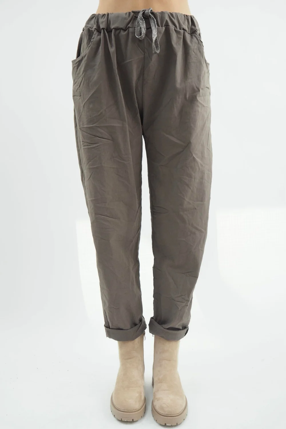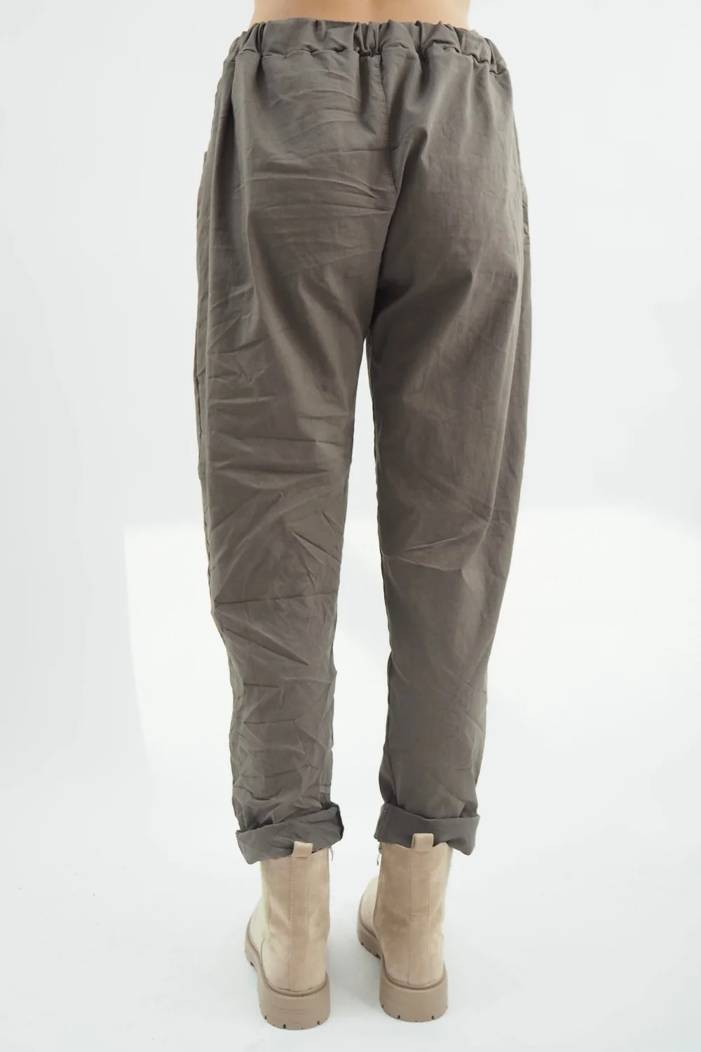 Introducing the epitome of effortless style and comfort : our Made in Italy Classic Magic Trousers in sleek Earth, brown tone. These extraordinary trousers are a game-changer, seamlessly blending unparalleled comfort and timeless elegance. Our Made in Italy Classic Magic Trousers possess a remarkable elasticity that adapts to your every move, making them a dream to wear throughout the day and night.