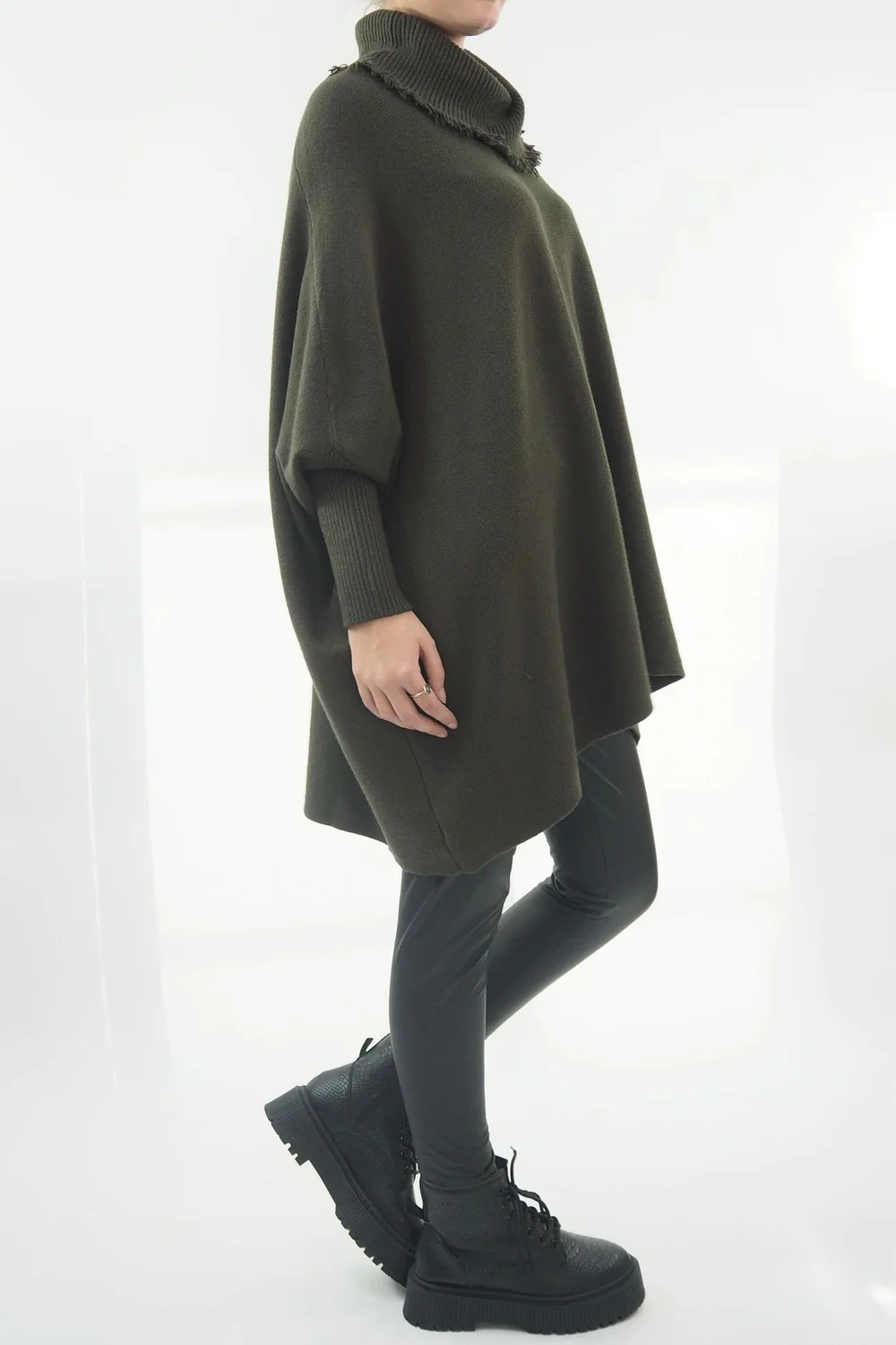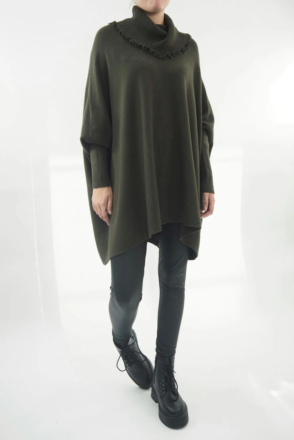 Picture yourself wrapped in the epitome of comfort and style with our latest obsession: the Conrad Oversized Fray Cowl Knit Top in Deep Khaki, green tone, from Made in Italy clothing. This luxurious piece effortlessly combines warmth and style, making it an essential addition to your autumn and winter wardrobe. Its oversized silhouette embraces you in a gentle embrace, perfect for those chilly days when you crave nothing but cosiness. Style with a pair of our Bodhi Tuck Cocoon Pants or with our Pesca Leather Look Leggings, this knit is a versatile and stylish choice that promises to keep you snug and stylish all season long.