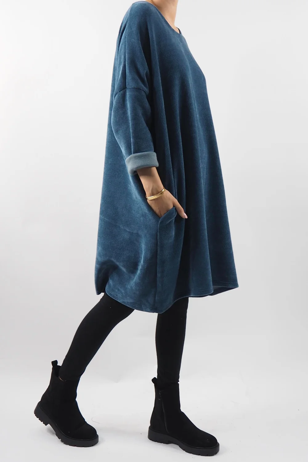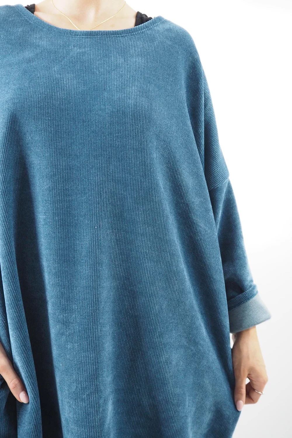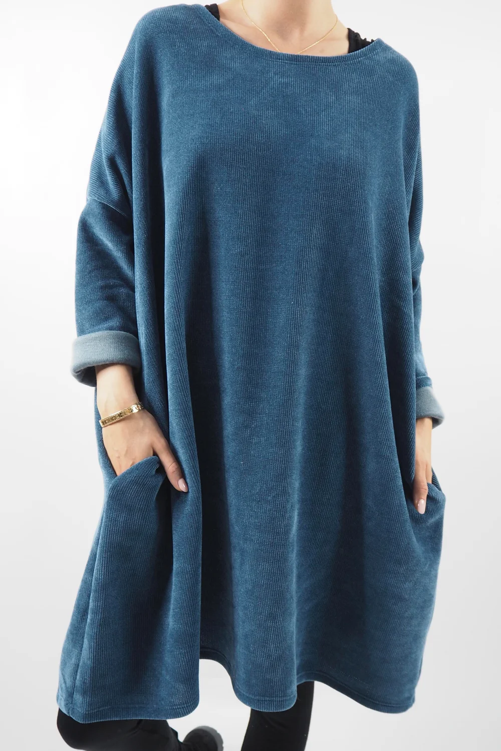 Our Dusk Sac Tunic in Airforce, blue tone, from Made in Italy Clothing: the epitome of everyday comfort and style. Crafted for those who demand both functionality and fashion in their daily attire, this tunic effortlessly marries versatility with a touch of effortless chic. The soft, stretchy needle cord fabric caresses your skin, providing all-day comfort, while the sac shape offers a relaxed and flattering silhouette for all body types. This tunic pairs seamlessly with our Cosy Leg Leggings. Elevate your everyday look with this must-have piece that’s both timeless and trendsetting, a testament to the fusion of comfort and style.