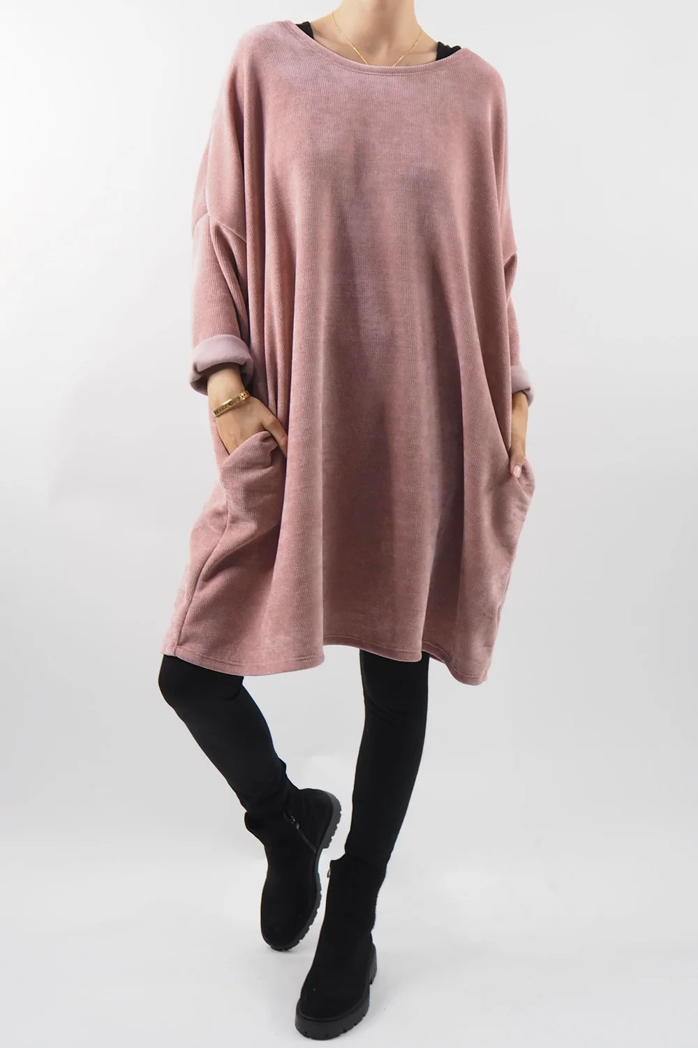 Our Dusk Sac Tunic in Rose, pink tone, from Made in Italy Clothing: the epitome of everyday comfort and style. Crafted for those who demand both functionality and fashion in their daily attire, this tunic effortlessly marries versatility with a touch of effortless chic. The soft, stretchy needle cord fabric caresses your skin, providing all-day comfort, while the sac shape offers a relaxed and flattering silhouette for all body types. This tunic pairs seamlessly with our Cosy Leg Leggings. Elevate your everyday look with this must-have piece that’s both timeless and trendsetting, a testament to the fusion of comfort and style.