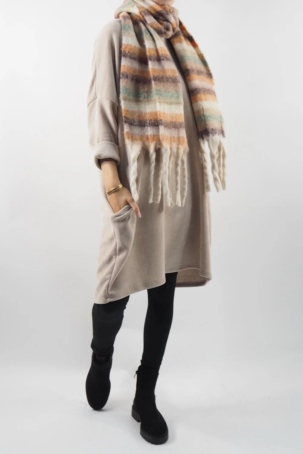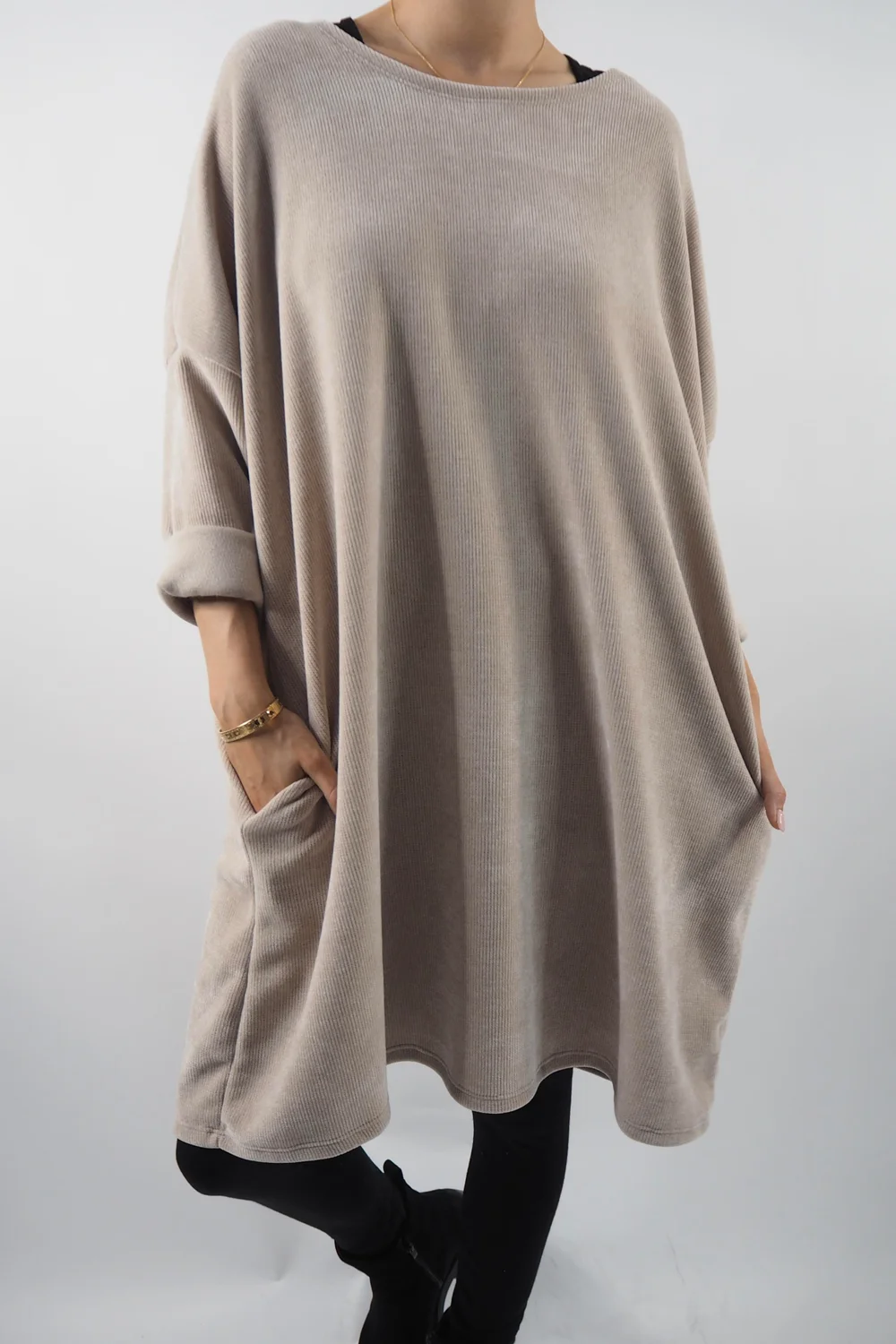 Our Dusk Sac Tunic in Stone, beige tone, from Made in Italy Clothing: the epitome of everyday comfort and style. Crafted for those who demand both functionality and fashion in their daily attire, this tunic effortlessly marries versatility with a touch of effortless chic. The soft, stretchy needle cord fabric caresses your skin, providing all-day comfort, while the sac shape offers a relaxed and flattering silhouette for all body types. This tunic pairs seamlessly with our Cosy Leg Leggings. Elevate your everyday look with this must-have piece that’s both timeless and trendsetting, a testament to the fusion of comfort and style.