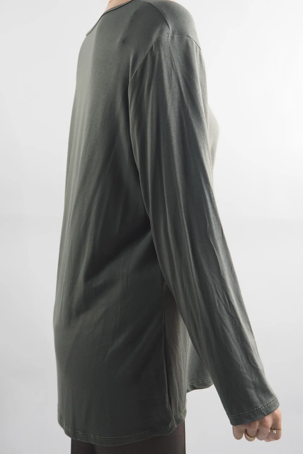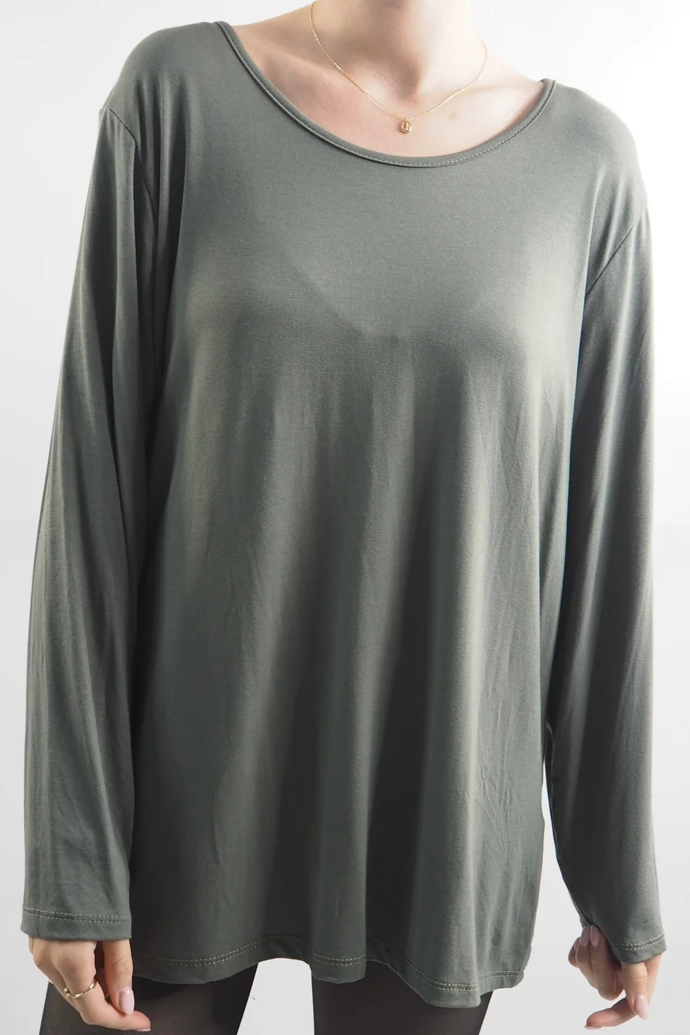 Everybody needs a fantastic quality, long sleeve top in their wardrobe : our Made in Italy Fine Jersey Long Sleeve Top in Khaki, green tone, is a must have piece. Crafted from a sumptuous blend of luxuriously soft fabrics, it glides over your skin, promising a sensation of pure luxury. With its long sleeves, this top effortlessly transitions from day to night, perfect for solo wear or as a chic layering piece. Great pieces to style with are our Pesca Leather Look Leggings or our Bodhi Tuck Cocoon Pants.