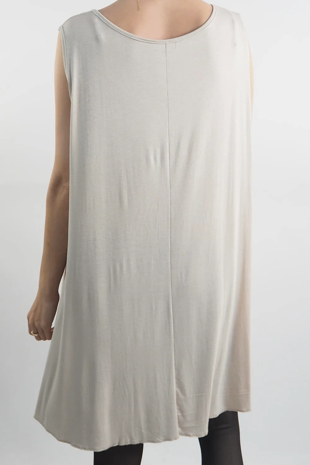 Apart of our Evergreen Collection is our Made in Italy Fine Jersey Swing Vest in a Stone, beige tone. This is the perfect base piece for all looks, all year round with its simplistic, scooped neckline and long line fit.