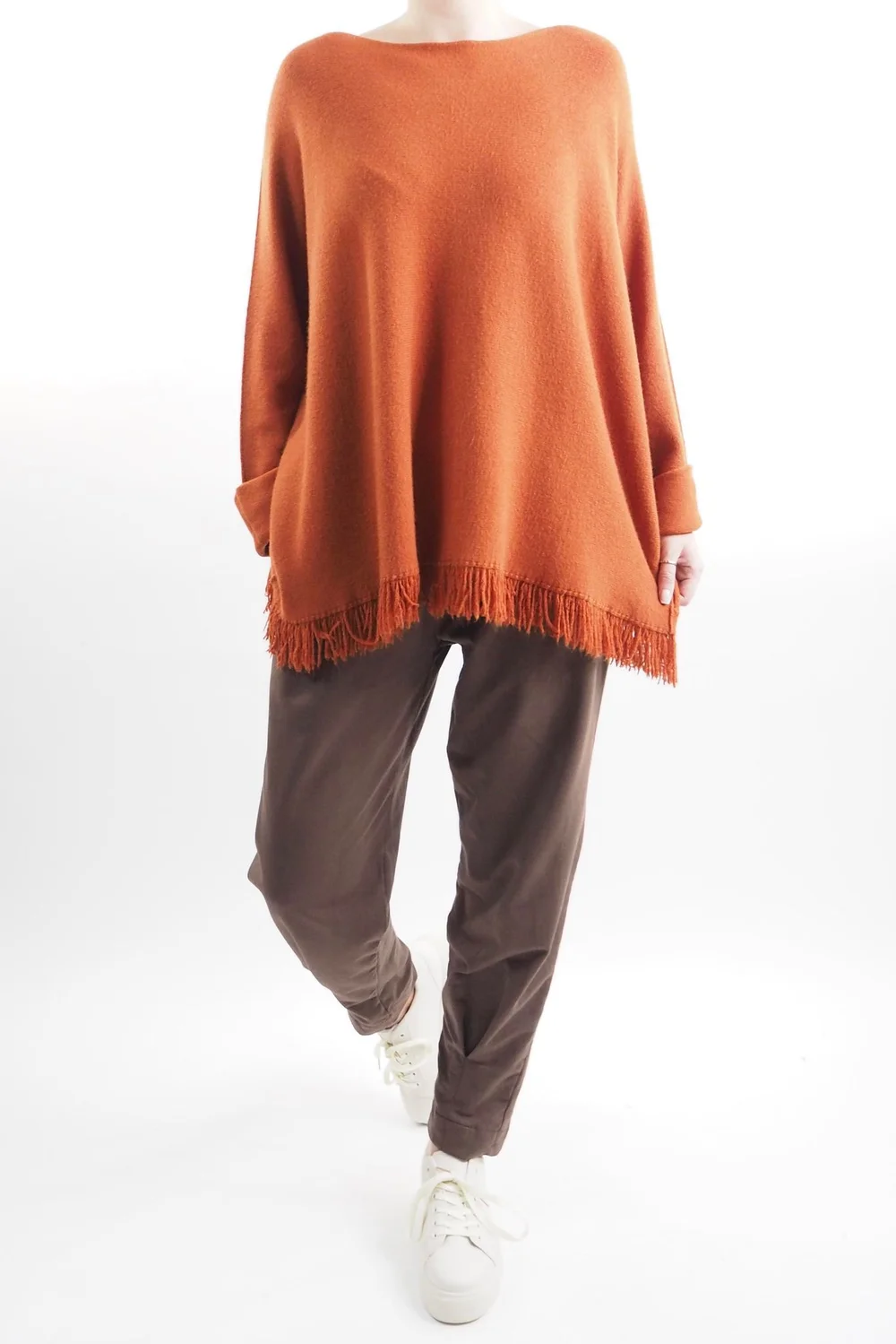 Step into autumn in style with our latest must-have: the Made in Italy Halo Fringe Box Knit Top in Saffron orange tone. This cosy yet chic piece is the perfect companion for a leisurely autumn walk. Its sumptuous fabric envelops you in comfort, while the fringe knit detail adds a touch of bohemian flair to your look. The tones are ideal for embracing the fall season, and its relaxed boxy silhouette ensures both fashion and function. Layer it over your favourite skinny pant or pair with a cocoon pant for an effortlessly on-trend autumn ensemble. Stay cosy and fashion-forward with this statement piece, and let the leaves fall as you walk in style.