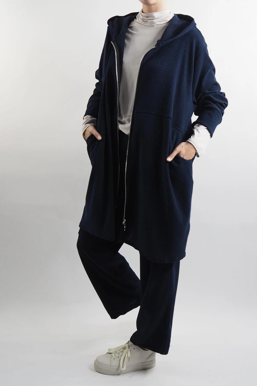 Elevate your everyday wardrobe with the ultimate in comfort and style: the Jumbo Softie Stretch Cord Long Zip Jacket in Ink, dark blue tone. This versatile piece is the epitome of cosy-chic, designed to seamlessly transition from a day out to a night in. Whether you’re running errands or lounging around the house, this jacket is your new go-to choice. Pair it with our fine jersey polo neck and cosy leg leggings for a timeless, snug ensemble, or create a complete corduroy look with matching Jumbo Softie Stretch Cord Cargo Pants.