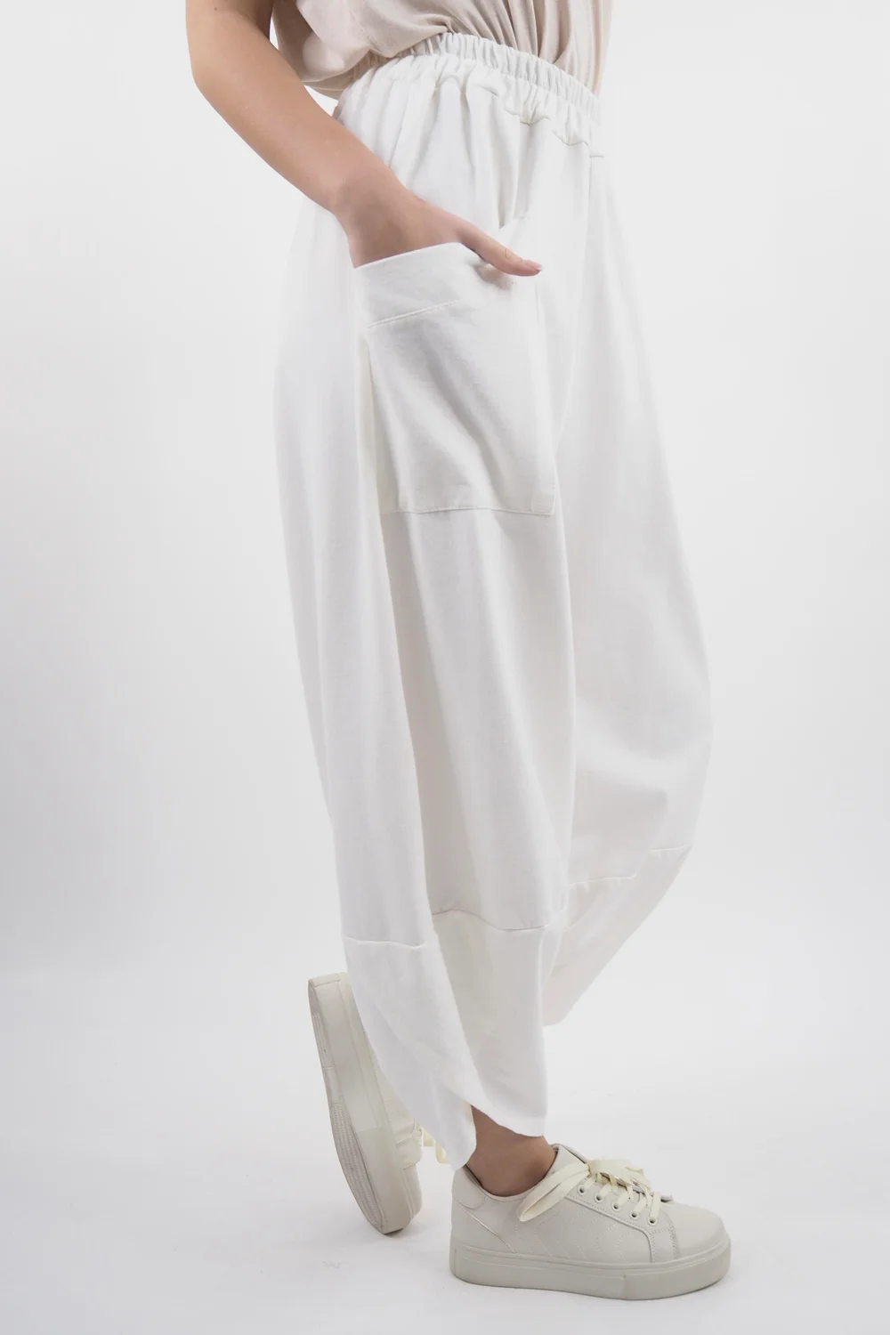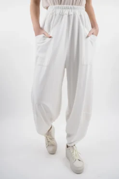 Prepare to elevate your casual wardrobe with the Made in Italy Lagenlook Shelby Cocoon Pant in a Ecru, warm white tone – is a modern twist on a timeless favourite that exudes effortless cool. These cocoon pants seamlessly blend comfort and style, making them a must-have staple for everyone. Made from the softest cotton, the scallop hem design adds a touch of contemporary twist. This unexpected detail sets these cocoon pants apart, making them a statement piece that effortlessly elevates any casual outfit. Embody the essence of casual sophistication with the perfect pant – a true fashion gem that will effortlessly take you from laid-back days to stylish nights with ease.