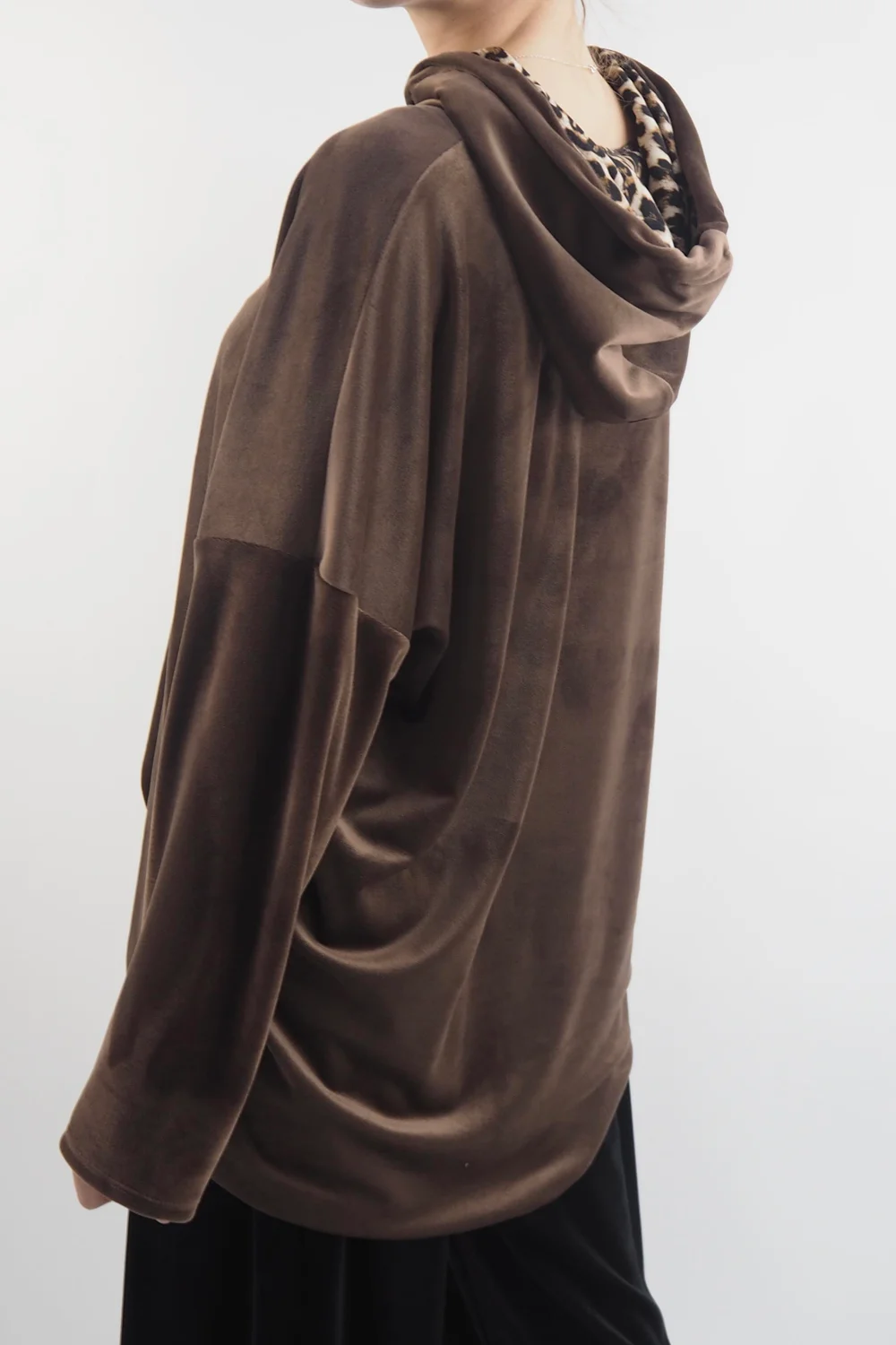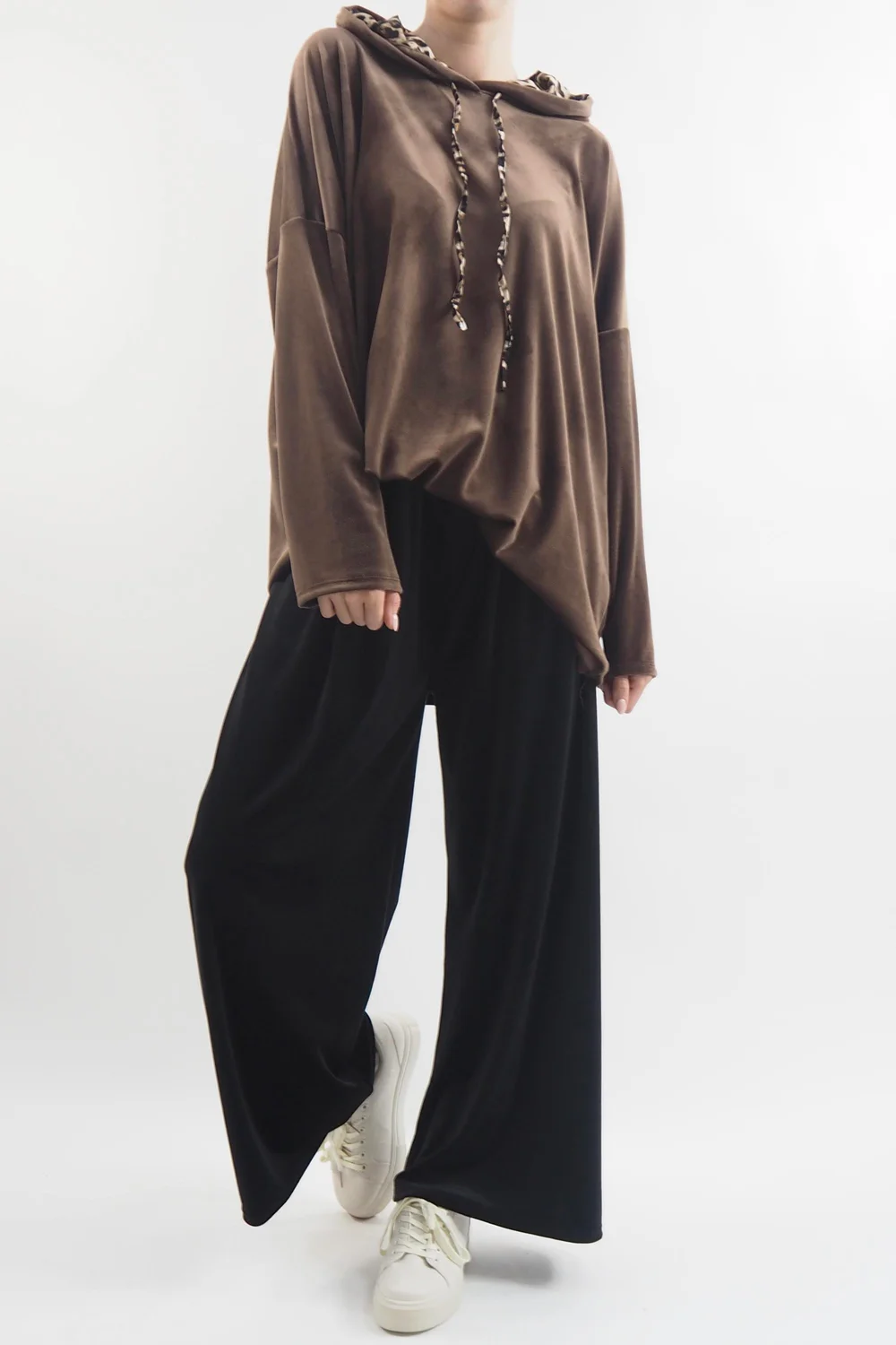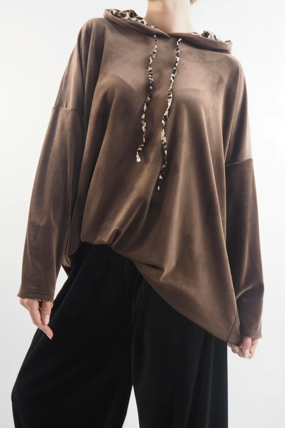 Get ready to elevate your autumn-winter wardrobe with a hoodie that is the epitome of cosy-chic: the Made in Italy Love Stretch Velour Hoodie in Chocolate, brown tone. This standout piece combines comfort with an unapologetic sense of glamour, making it a must-have addition. The leopard print hood adds a fierce and playful touch, allowing you to channel your inner wild side. Style with the trousers from your Black Chalet Soft Stretch Velour Set for the perfect look.