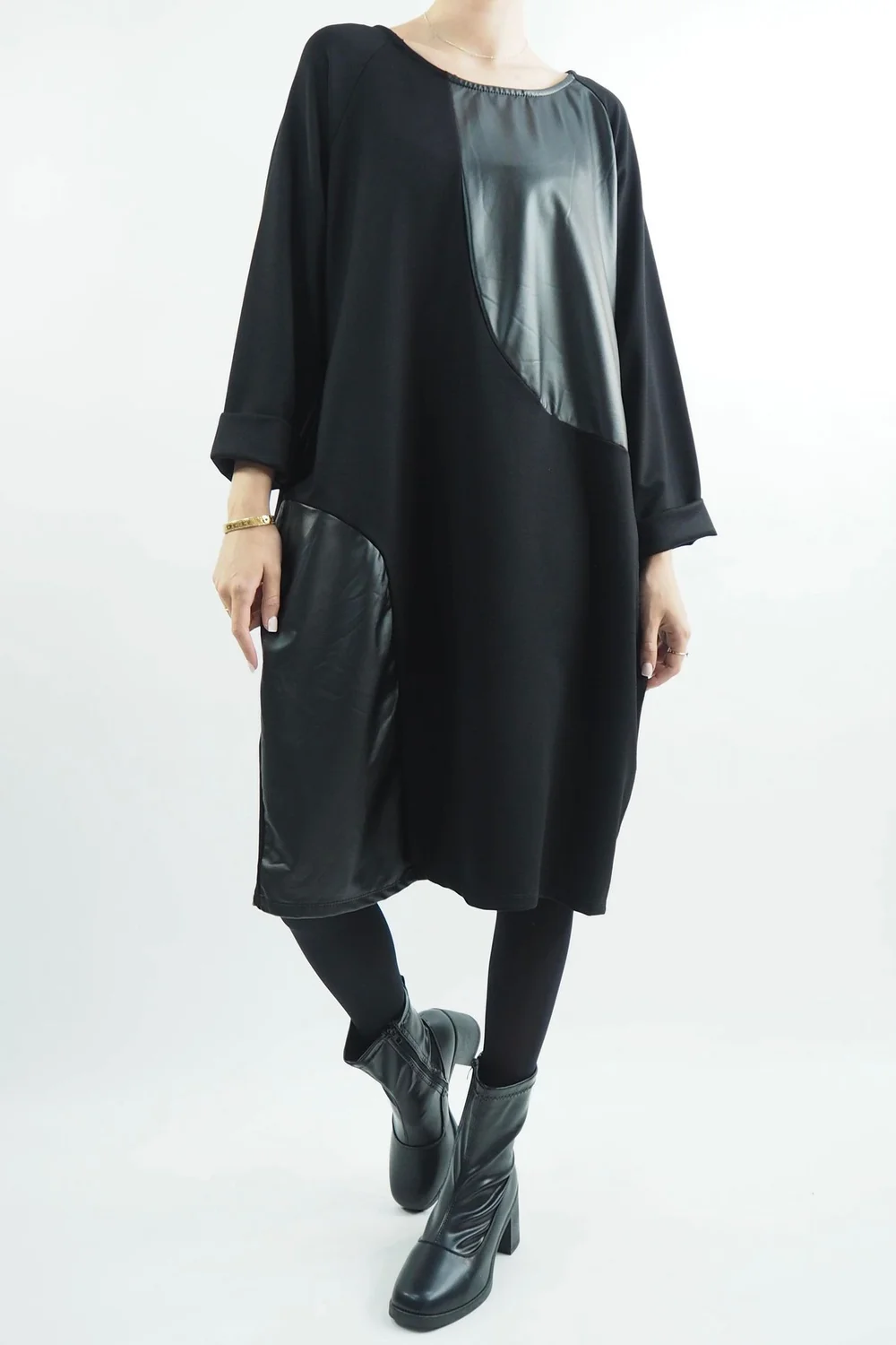 Introducing the epitome of modern elegance: the Made in Italy Moxie Orbit Dress with its exquisite faux leather detailing. This fashion marvel effortlessly marries sophistication with edgy flair, making it an absolute must-have for the style-savvy. The supple faux leather accents, strategically placed asymmetrically on the shoulder and hem, add a daring edge to this timeless piece. Crafted from luxurious, breathable materials, it guarantees comfort without compromising on style.
