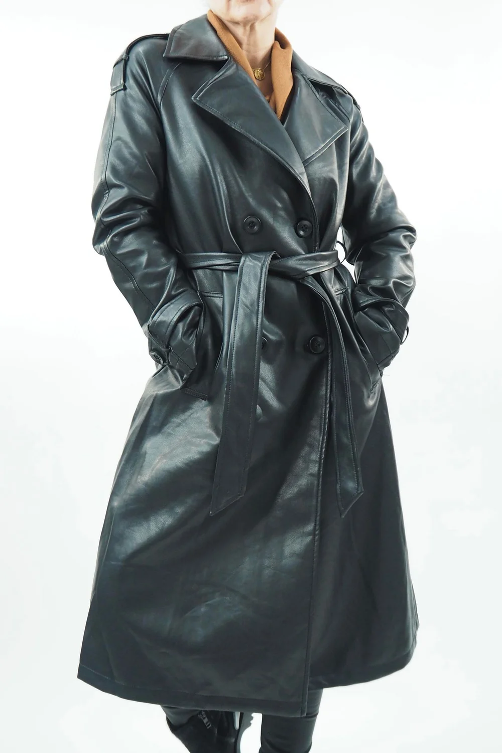 Unleash your inner rebel with our Made in Italy Neo Trench Coat in Black, a daring testament to modern edge and timeless sophistication. This iconic piece redefines the classic trench, crafted meticulously from luxurious faux leather that’s indistinguishable from the real thing. Its sleek silhouette and waist-cinching belt create a bold yet refined look, while the supple material adds an unexpected tactile element