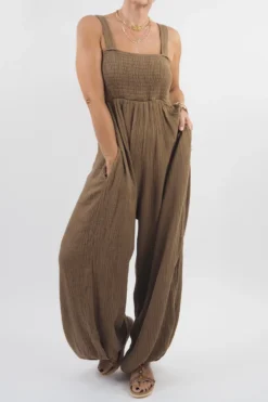 Prepare to be enamored by the sheer opulence and glamorous allure of the Made in Italy Obi Crepe Cotton Balloon Jumpsuit in a Saddle, Mid Brown tone! This extraordinary creation embodies the pinnacle of fashion-forward sophistication, setting a new standard for sartorial elegance. Crafted with meticulous attention to detail, the jumpsuit showcases the finest crepe cotton, enveloping the wearer in a luxurious embrace that exudes grace with every step. The shirring elasticated bust not only ensures a flattering and customized fit but also adds a touch of allure to the neckline, perfectly complementing the décolletage. The pièce de résistance, however, lies in the mesmerizing balloon silhouette that cascades effortlessly down the legs, creating an enchanting visual dance with every stride. Emanating an air of effortless chic, this jumpsuit transcends mere clothing to become an artful expression of individuality and style.Â