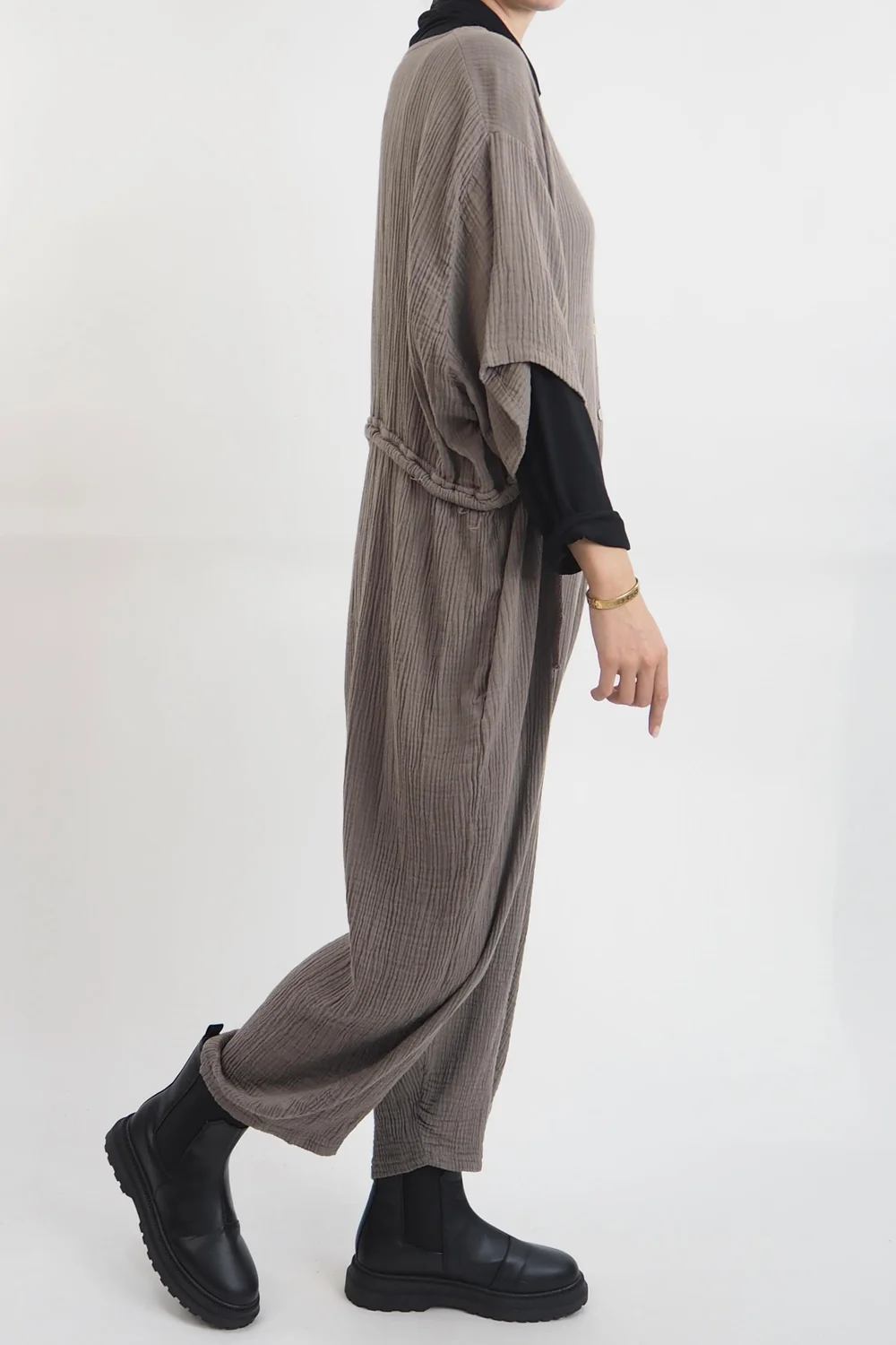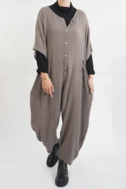 Introducing our latest fashion-forward creation – the Made in Italy Obi Crepe Cotton Boilersuit in Mushroom. Crafted from luxurious and breathable cotton, this boiler suit is the epitome of comfort and style. The loose-fitting silhouette offers both ease of movement and a relaxed vibe, perfect for any occasion. The pull-tie waist allows you to cinch in for a more defined shape or leave it loose for an effortless and carefree look. Adorned with button fastenings, this suit exudes a touch of vintage charm while providing functional ease in getting in and out. Whether you dress it up with heels and statement accessories or embrace a casual look with sneakers, our Made in Italy Obi Crepe Cotton Boilersuit is a versatile and chic addition to your wardrobe that will have you looking effortlessly chic all day long.