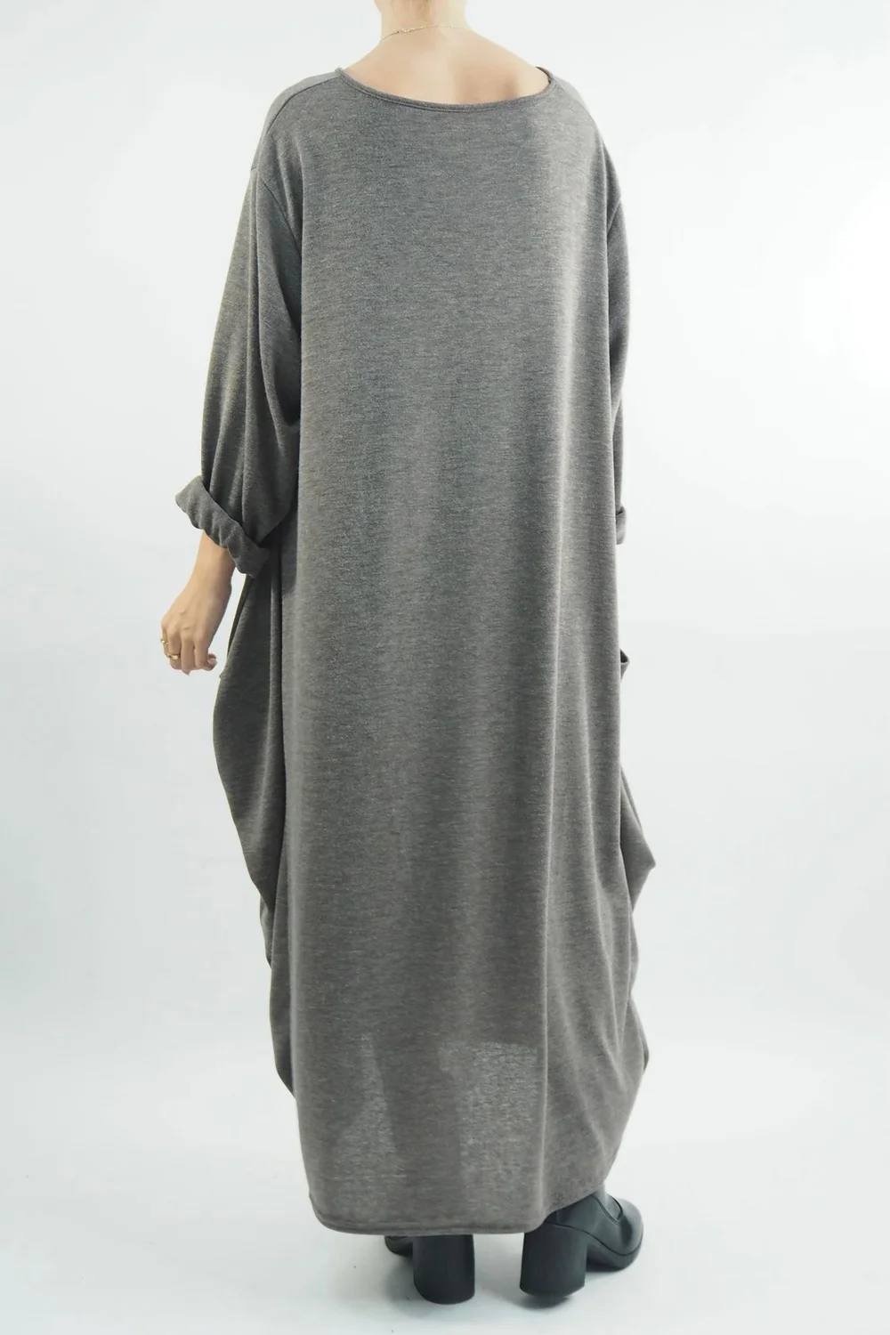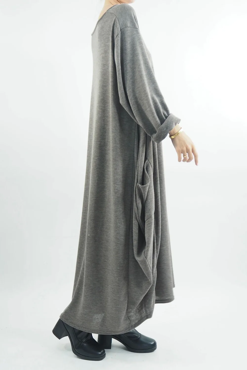 Behold the versatile Made in Italy oversized fine knit pocketed cocoon dress, in Mushroom, brown tone , adorned with pockets. This masterpiece celebrates individuality, catering to all shapes and sizes with its universally flattering silhouette. The cocoon-style draping gracefully conceals and reveals, ensuring comfort and confidence for every wearer. Whether you’re strolling through an art gallery, sipping cocktails at a rooftop, or simply enjoying a leisurely brunch with friends, this dress effortlessly takes you from day to night. Embrace your inner artist and let this maxi pocketed cocoon dress be your canvas for self-expression. With its exquisite blend of style, comfort, and originality, it’s the perfect choice for any occasion that calls for a touch of artistic flair. Dress it up or down, and let your fashion sense paint the town with brilliance, it’s the perfect dress for layering too.