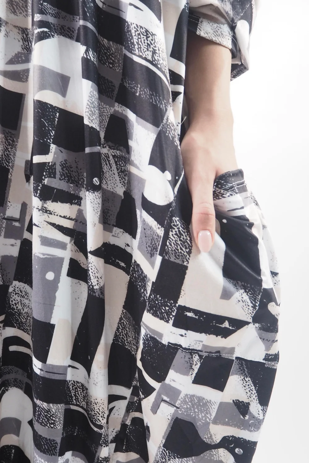 Introducing the ultimate statement piece: our Made in Italy Oversized Tech Soft Cocoon Dress Cubist in Monochrome, that’s not only a visual masterpiece but also a sensory delight. The Cubist-inspired print, a kaleidoscope of geometric shapes and vibrant colors. Its stretch fabric ensures a flawless fit, effortlessly draping your body in a chic and relaxed silhouette. Â