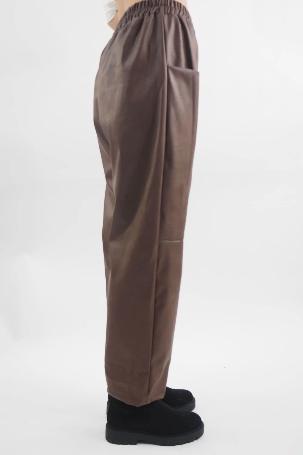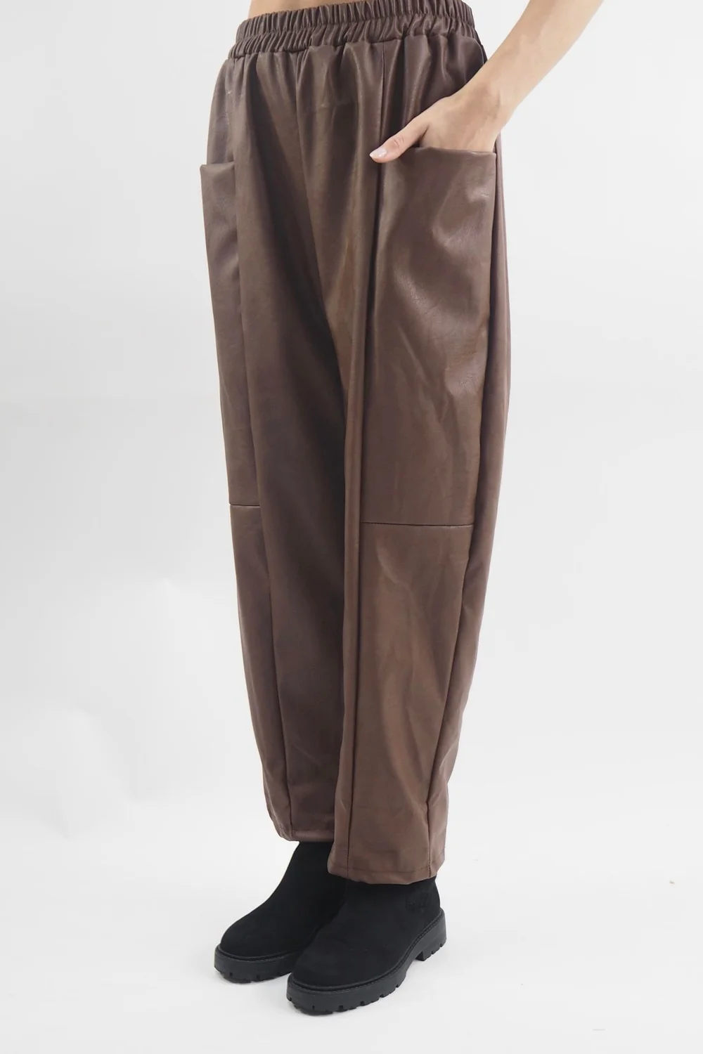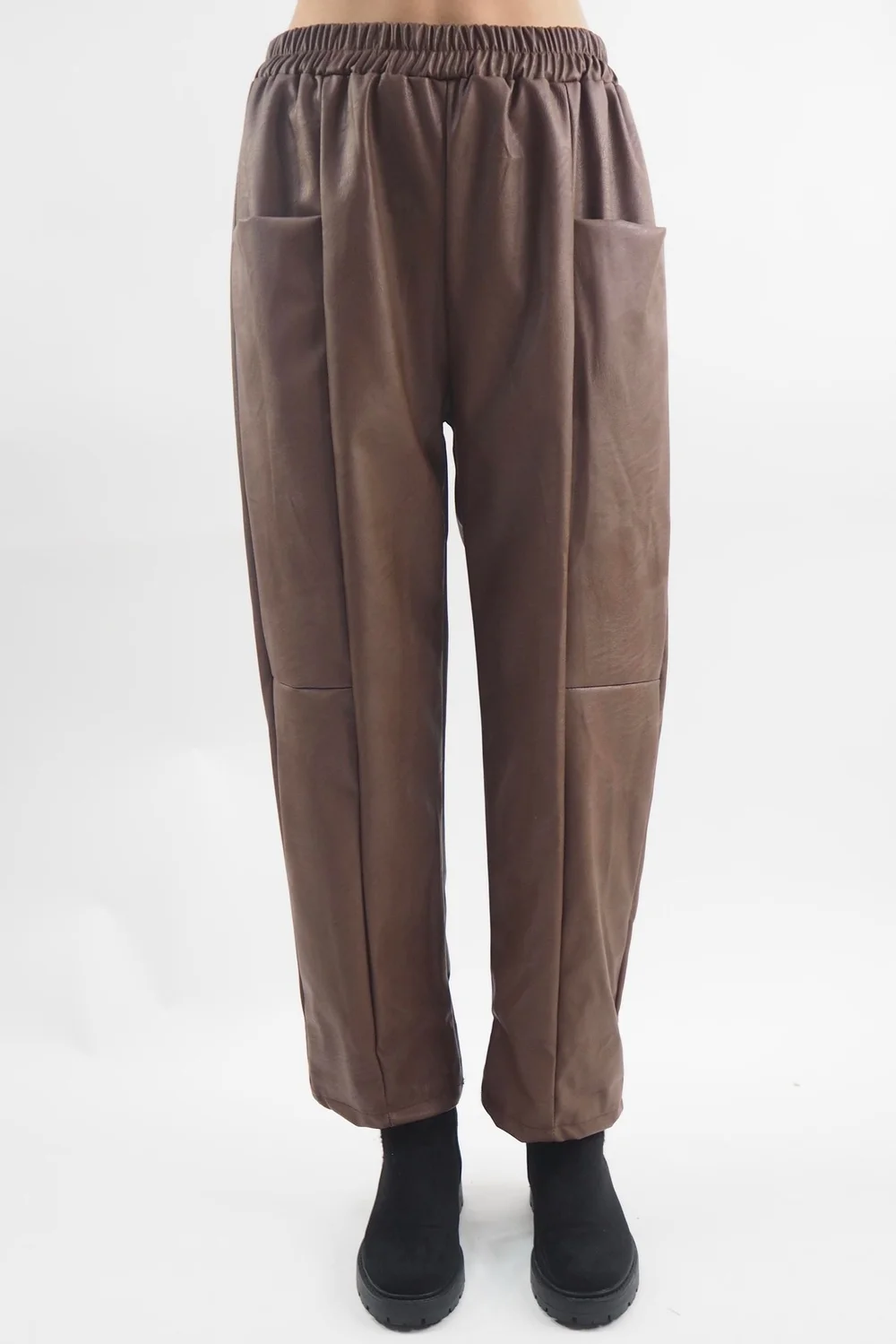 The Made in Italy Pesca Leather Look Deep Pocket Pant in Chestnut, brown tone: the epitome of modern chic: a pair of edgy straight-leg leather-look trousers that effortlessly blur the lines between sophistication and casual cool. The leather-like fabric exudes a bold attitude, offering a luxurious feel. What sets these trousers apart is their deep pocket detailing, adding a utilitarian edge while ensuring practicality and style go hand in hand. Whether you’re aiming for a polished, office-ready ensemble or a laid-back, off-duty look, these versatile trousers are your go-to choice. Style with a white shirt or fine jersy polo neck and knitwear for the perfect autumn look.