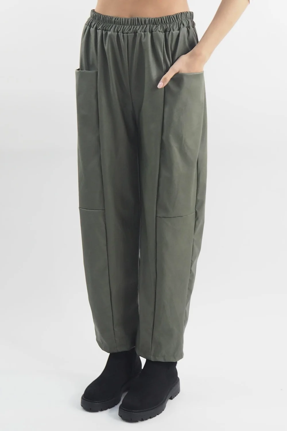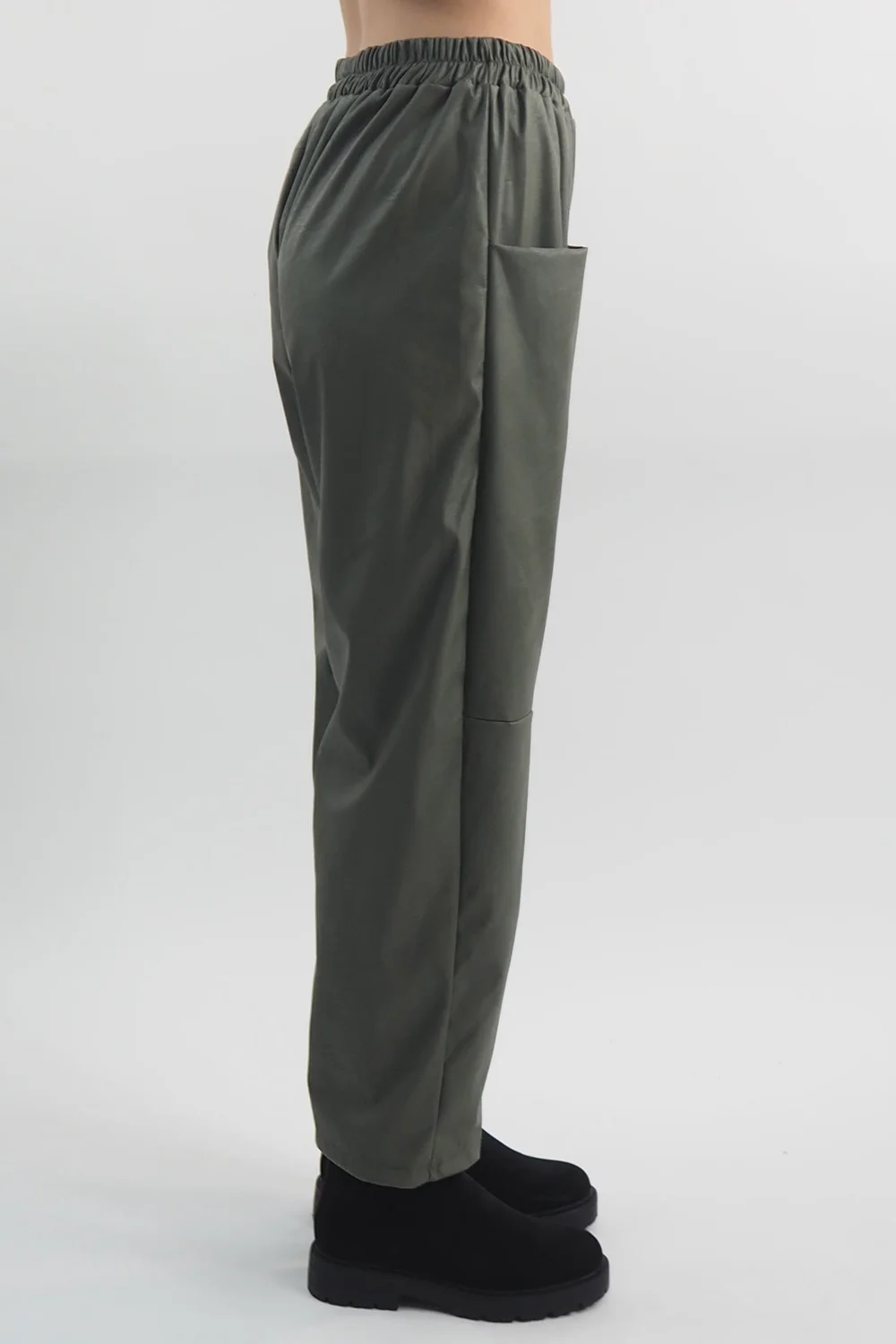 The Made in Italy Pesca Leather Look Deep Pocket Pant in Khaki, green tone: the epitome of modern chic: a pair of edgy straight-leg leather-look trousers that effortlessly blur the lines between sophistication and casual cool. The leather-like fabric exudes a bold attitude, offering a luxurious feel. What sets these trousers apart is their deep pocket detailing, adding a utilitarian edge while ensuring practicality and style go hand in hand. Whether you’re aiming for a polished, office-ready ensemble or a laid-back, off-duty look, these versatile trousers are your go-to choice. Style with a white shirt or fine jersy polo neck and knitwear for the perfect autumn look.