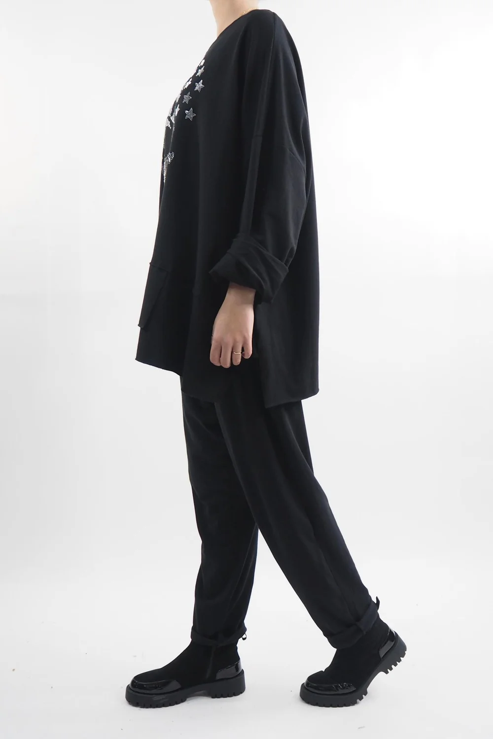 The star skull micro stud pattern creates a mesmerizing contrast, adding a touch of rebellious glamour to your look. Whether you’re rocking it with bodhi tuck cocoon pant or our Laundry B DAS Premium Sculpt Denim Legging, this top effortlessly fuses comfort with an undeniably chic edge.