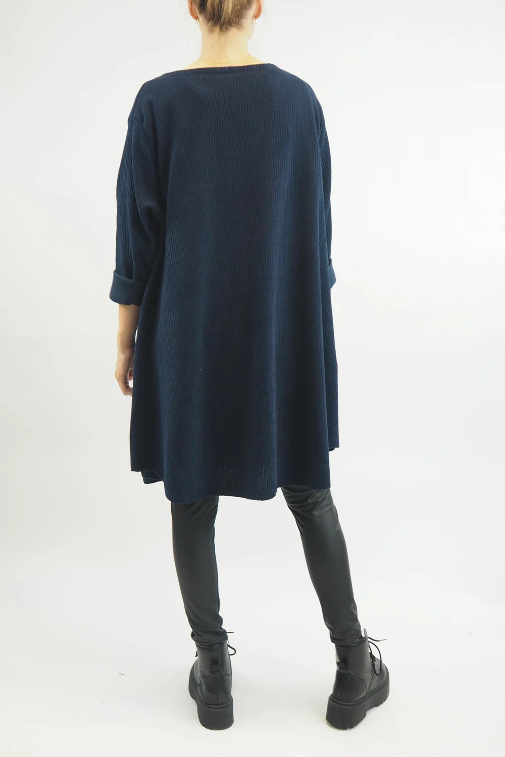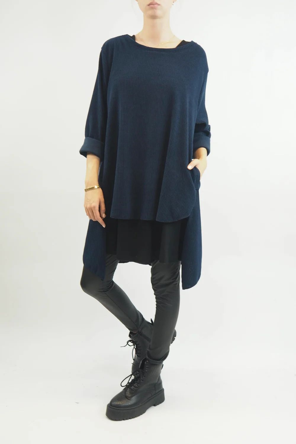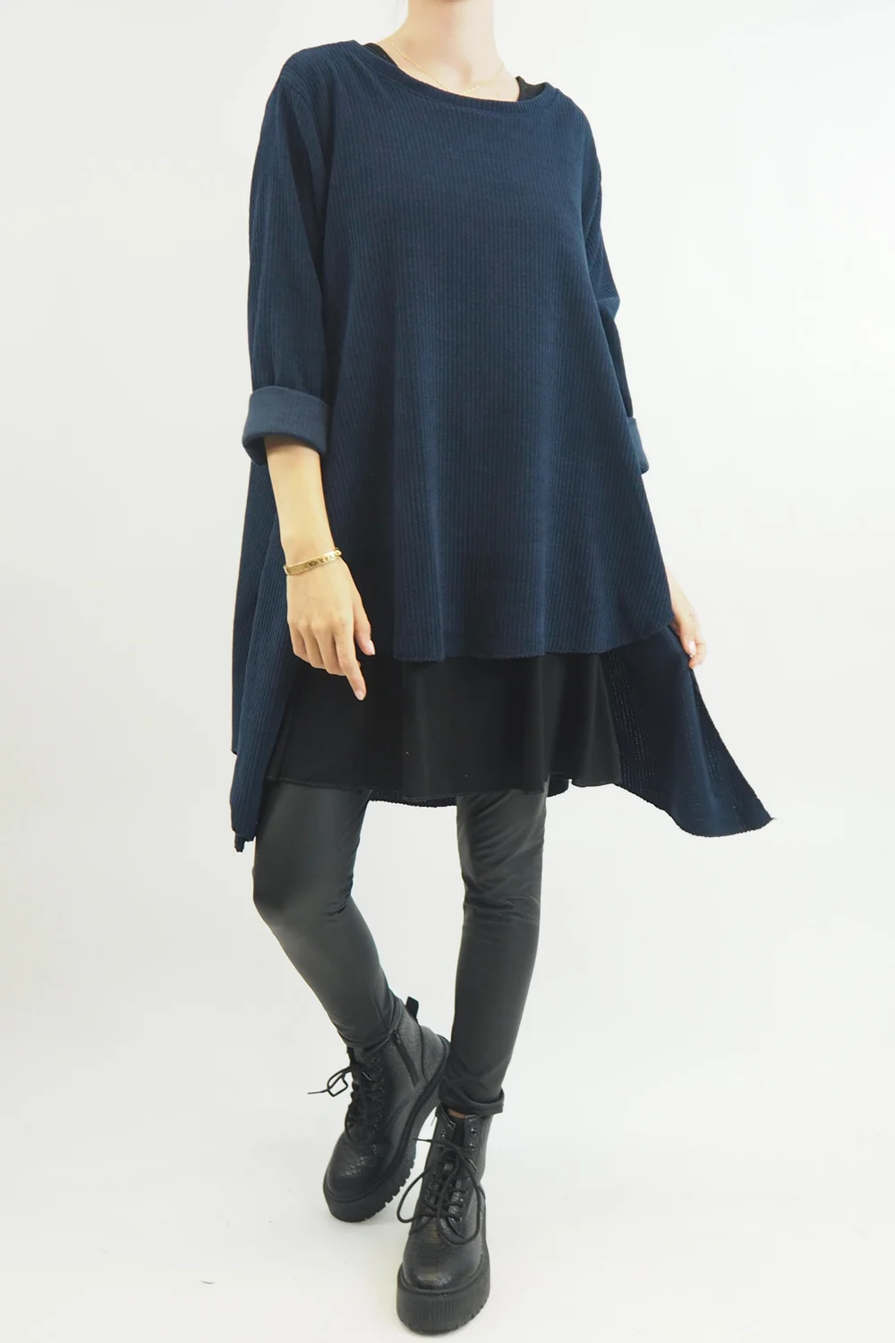 Made In Italy Rib Velvet Soft Stretch Pocket High Low Top Navy