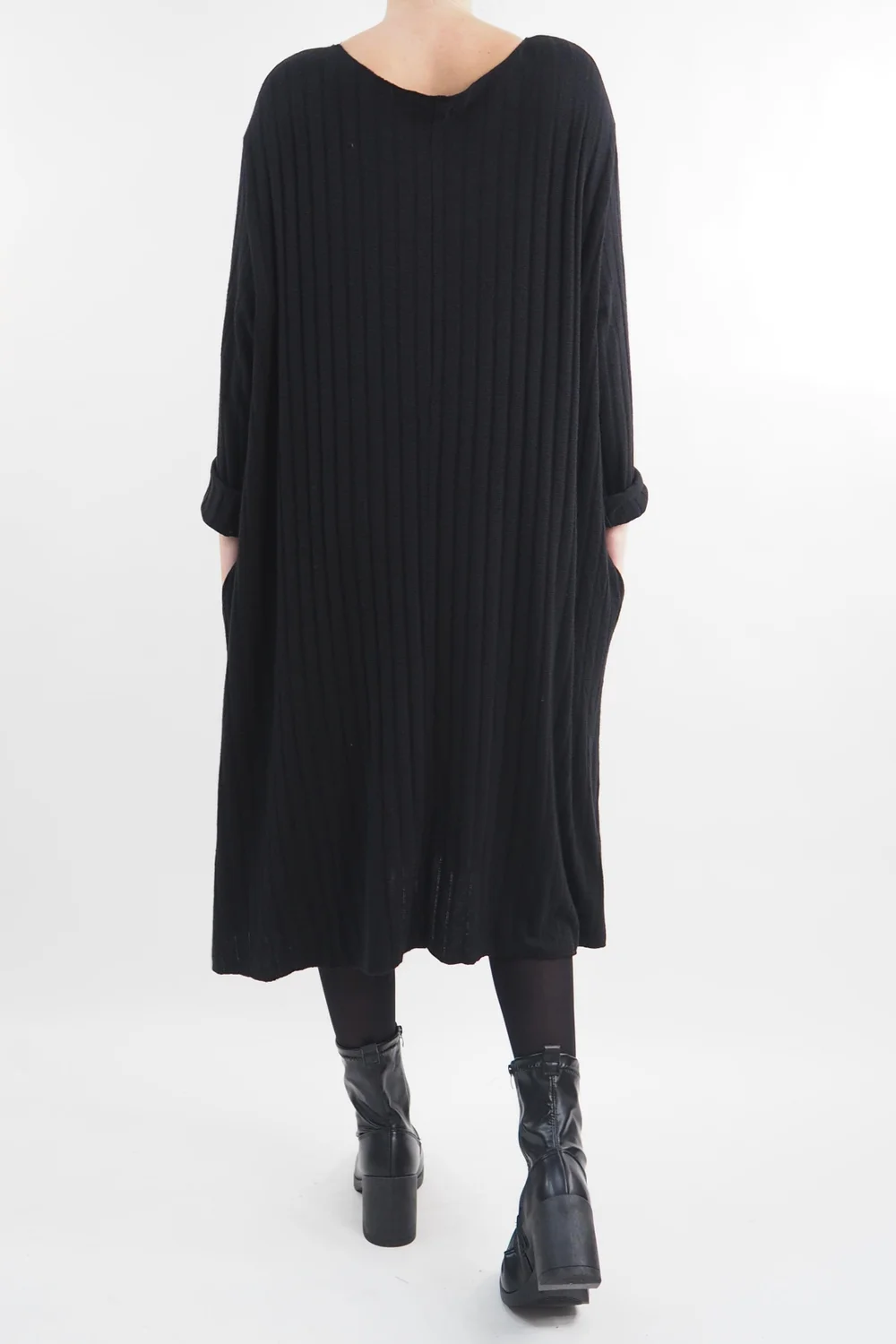 Made In Italy Ribbed Soft Knit Trapeze Dress Black