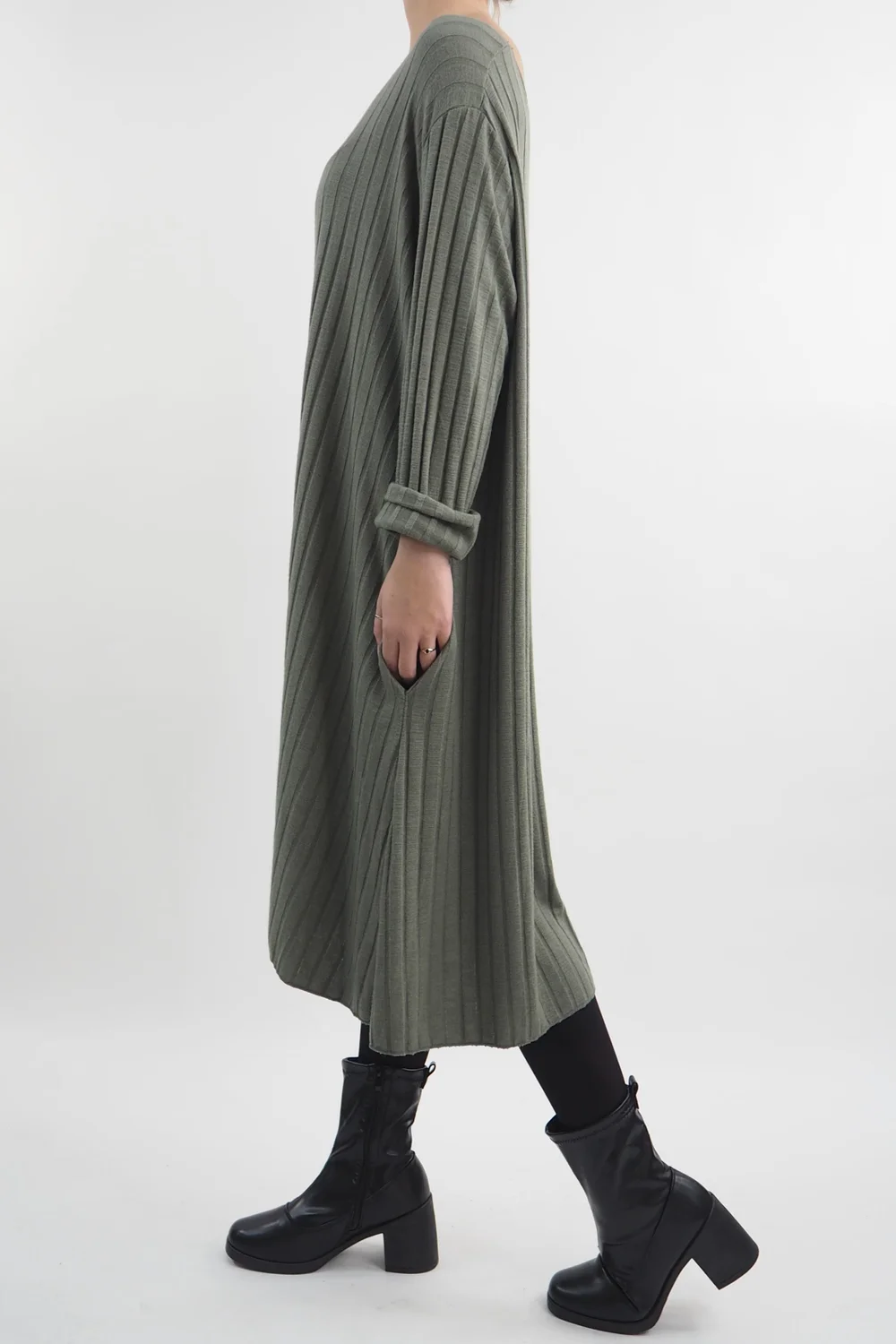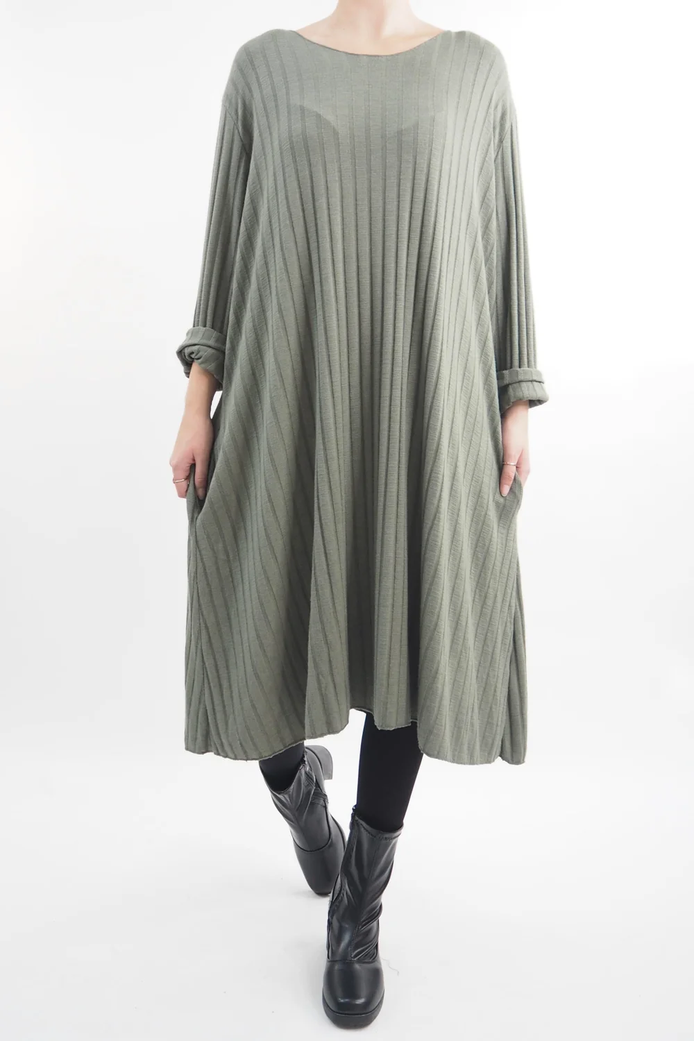 Introducing the epitome of effortless chic: our Ribbed Soft Knit Trapeze Dress in Khaki, green tone, from Made in Italy Clothing. This versatile garment is a must-have in everyones wardrobe. Whether you’re opting for a sporty, urban look with a pair of our Bromley pumps or channeling sophistication with a heeled Richmond boot, this dress is your canvas for style exploration. Elevate your fashion game effortlessly with this dress, making it the ultimate choice for those who crave comfort without compromising on style.