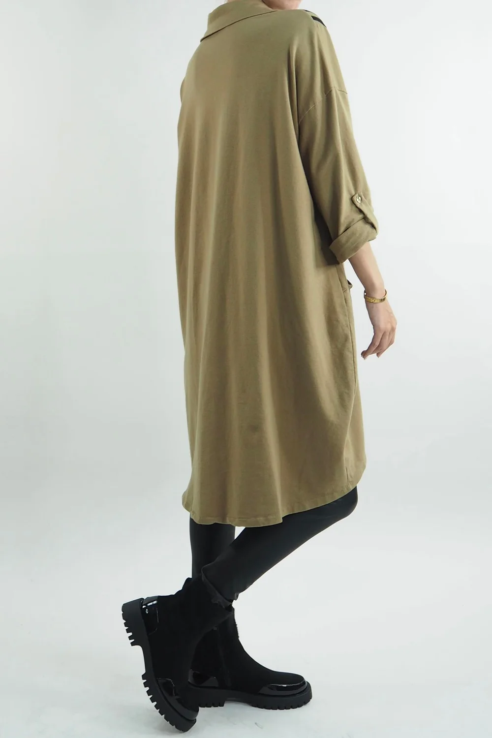 As the seasons shift, so does our fashion sensibility, and this Made in Italy Samba Cocoon Dress in Toast tan tone with its sporty stripes and collar detail is the epitome of versatility for the changing weather. This athleisure piece seamlessly blends elegance and comfort, making it a must-have in every wardrobe.The cocoon silhouette offers an casual and flattering drape, allowing for ease of movement whilst looking stylish. Wear with our Bodhi Biker boot and Pesca leggings for that effortless sporty look perfect for wearing everyday.
