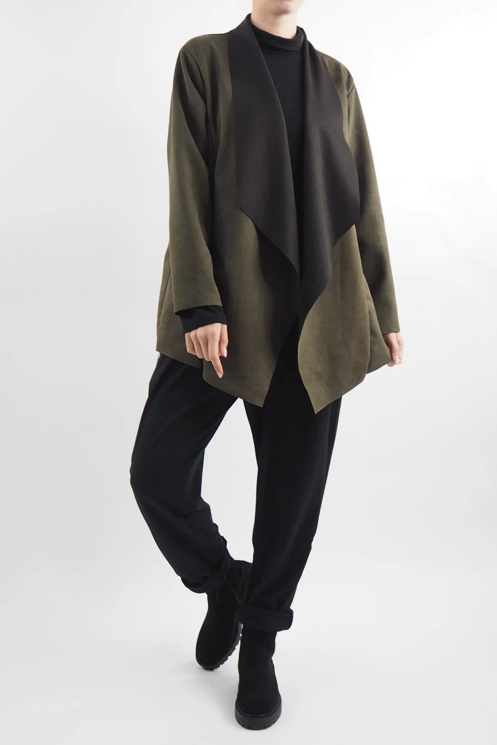 The Made in Italy Sander Moleskin Touch Waterfall Blazer in Bonsai green tones, these jackets are a dream come true, combining the luxurious look of moleskin with the cruelty-free appeal of faux leather. With the waterfall vibe, these jackets are the epitome of cool confidence, effortlessly elevating any outfit to new heights. The faux moleskin material not only adds a touch of opulence but also provides a velvety softness that feels like a dream against the skin. The drawstring waist gives shape and flatters all body types, making a strong statement wherever you go.