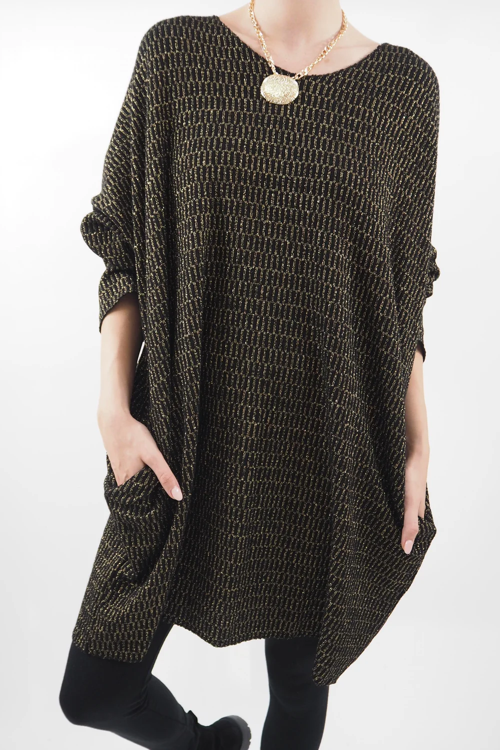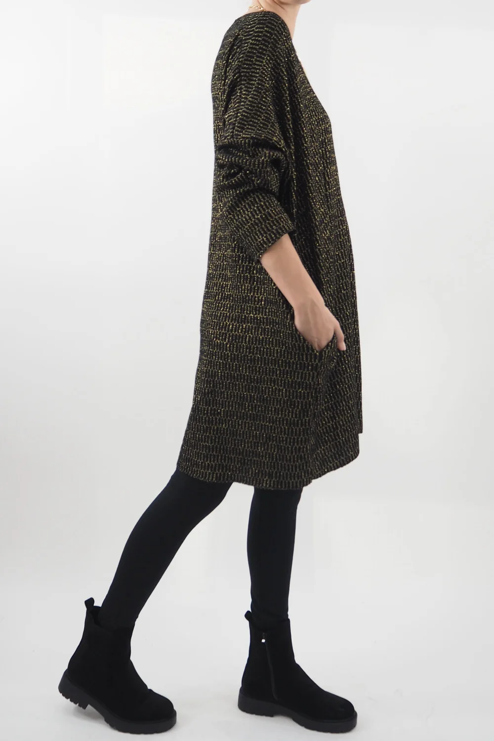 Introducing the epitome of versatile fashion: the Made in Italy Shimmer Me Softly Dress in Black. This enchanting garment effortlessly bridges the gap between everyday chic and party season glamour. Crafted with a shimmering lurex thread, it exudes a subtle sparkle, making it a standout choice for both casual strolls and festive soirees. Its comfortable shift silhouette ensures a flattering fit while maintaining a relaxed feel, perfect for all-day wear. Style with tights and Kensington 72’s or Cosy Legs and Chunky Boots.