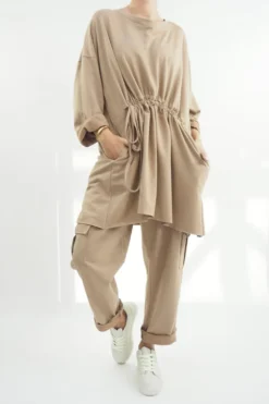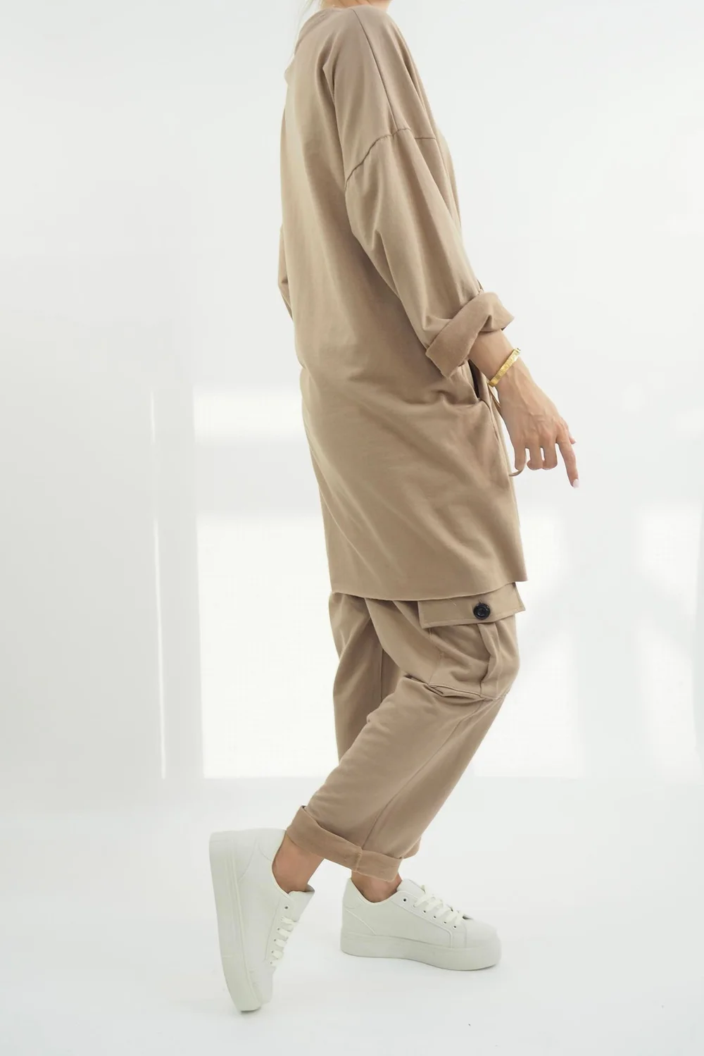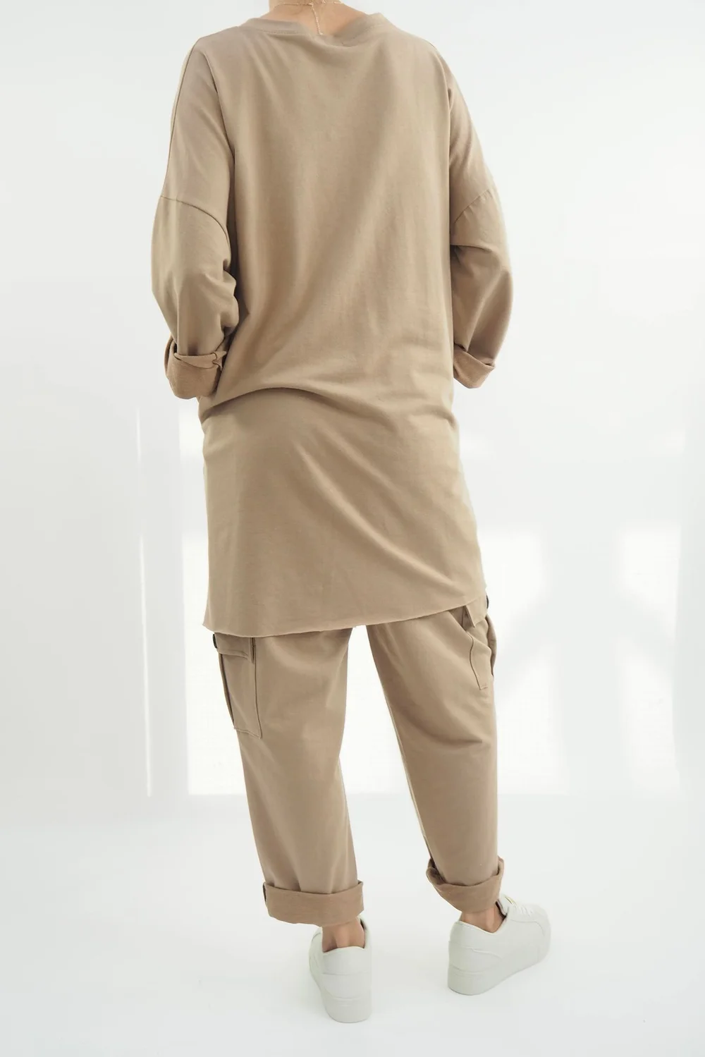 A timeless masterpiece: add our Made in Italy Tali Pull Tie Top in Toast, tan, brown tone, to your wardrobe. Comfort and sophistication, this garment transcends the ordinary with it’s adjustable pull-tie detail. Crafted from the purest cotton. Style with our Made in Italy Tali Cargo Joggers or Lagenlook Classic Cocoon Pants for the perfect look.