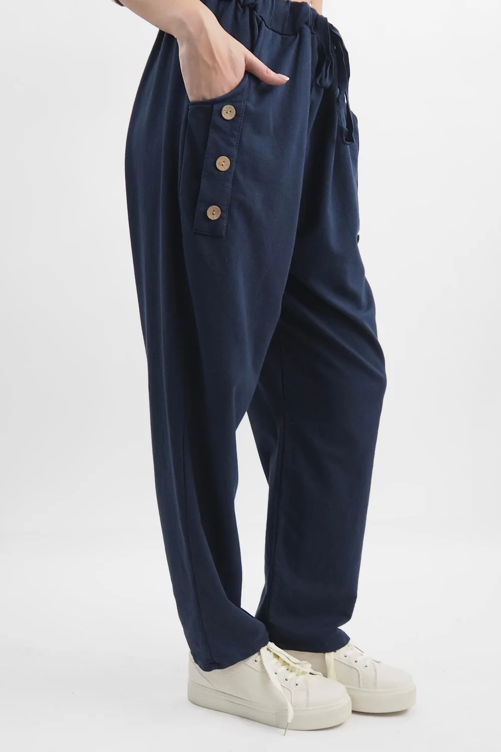 A revolution in comfort and style: the Made in Italy Tali Three Button Straight Leg Pant in Ink, dark blue with three coconut button and pocket detailing. These pants are effortless to wear and style, boasting a silhouette that artfully blurs the lines between structured elegance and cosy relaxation. The addition of meticulously crafted pockets and coconut button details not only offers functional flair but also elevates the pant into bold sophistication, ensuring you exude confidence with every step.