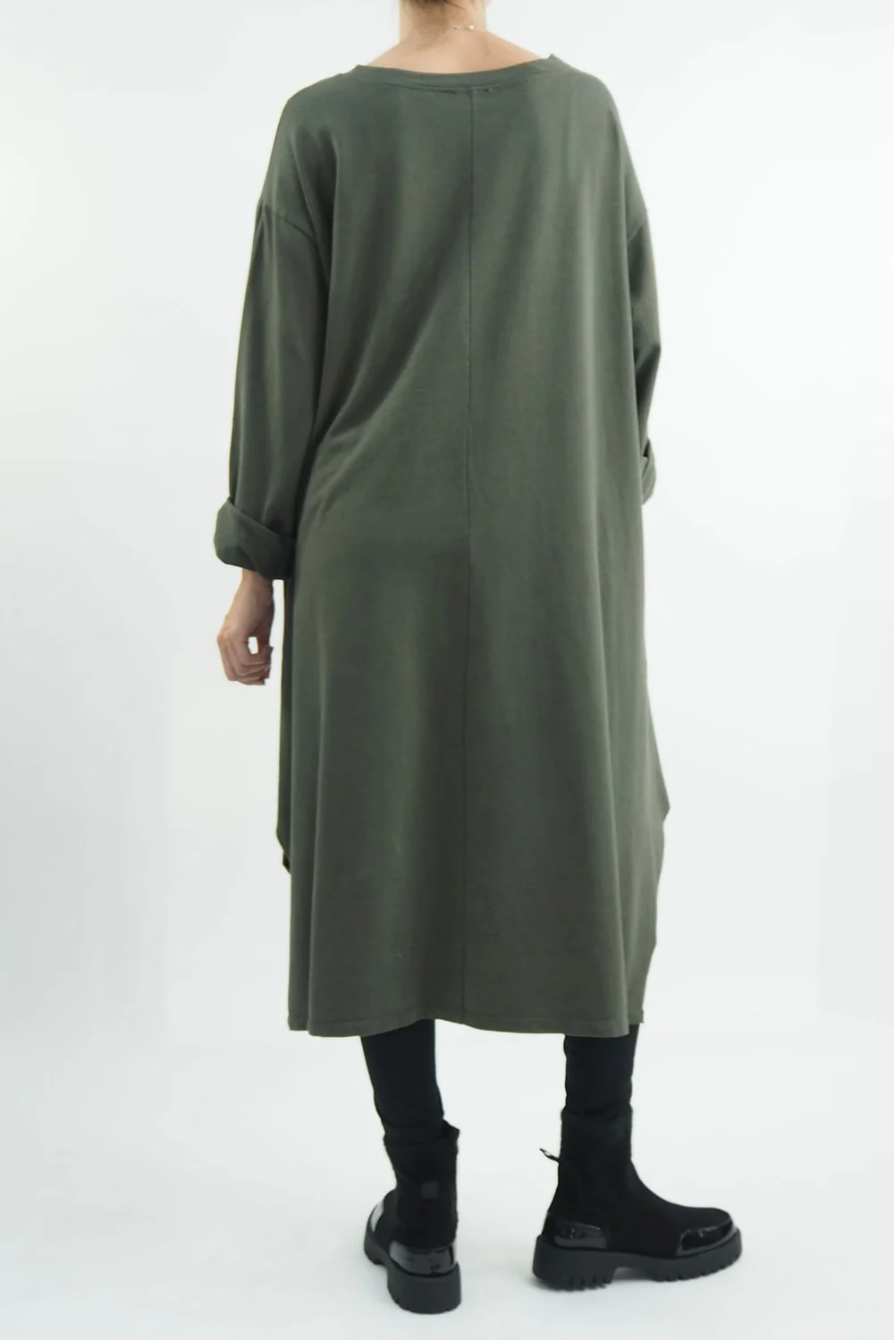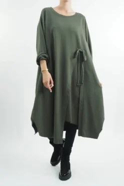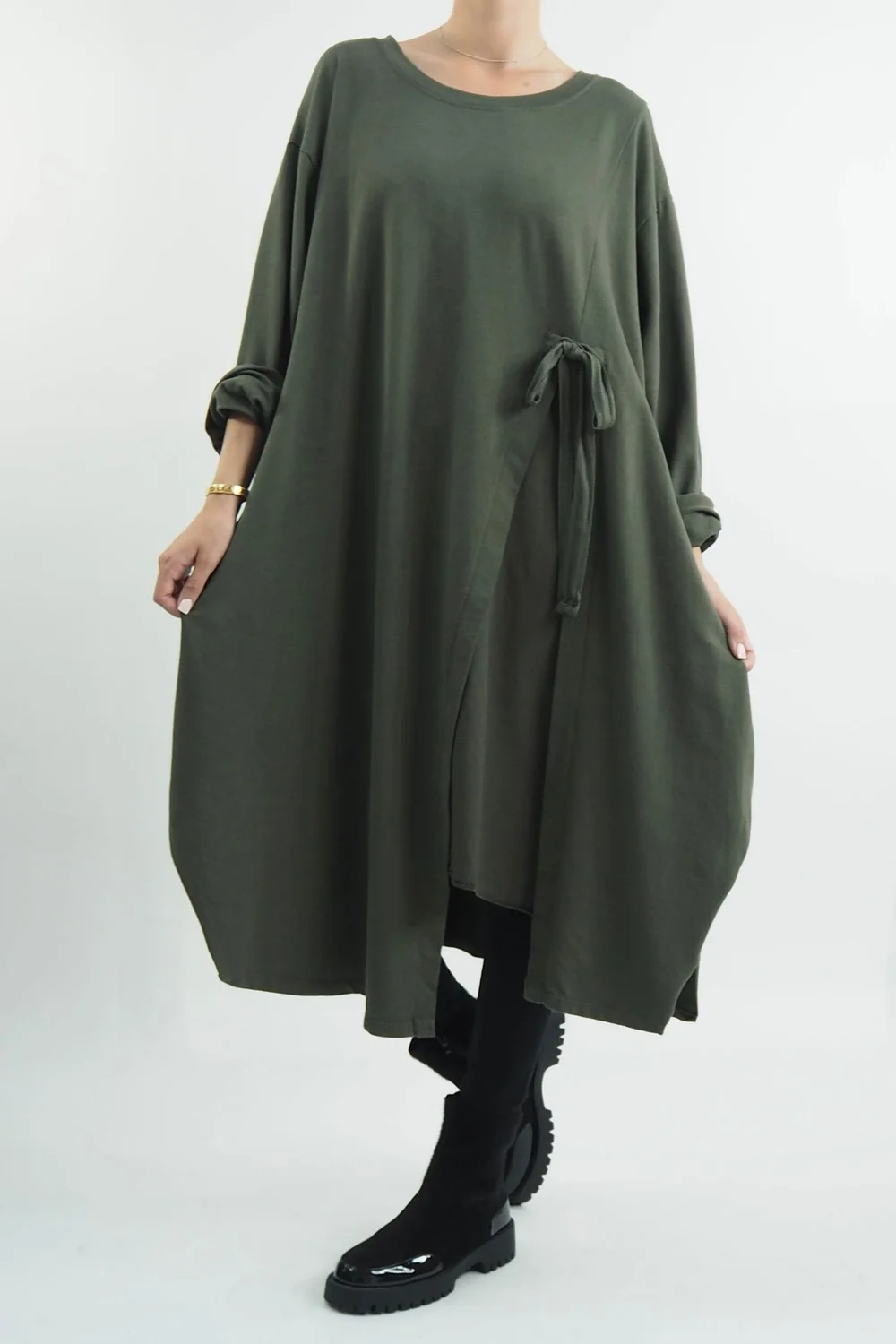 As the seasons shift, so does our fashion sensibility, and this Made in Italy Tokyo Tie Dress in Bonsai green tone with its exquisite panel and tie bow detail is the epitome of versatility for the changing weather. This timeless piece seamlessly blends elegance and comfort, making it a must-have in every fashion-savvy wardrobe.The trapeze silhouette offers an airy and flattering drape, allowing for ease of movement while maintaining a sense of effortless grace. With its intricate panel design, this dress adds an extra layer of sophistication, creating a visual masterpiece that effortlessly transitions from day to night.The pièce de résistance of this ensemble is undoubtedly the charming tie bow detail. Placed strategically at the neckline or waist, it adds a touch of playfulness and refinement.