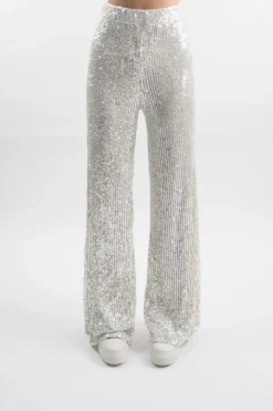 Elevate your autumn-winter wardrobe to new heights of glamour with our Made in Italy Trinny Shimmer Palazzo Trouser in Ecru beige and Silver sequin shimmer fabric – a dazzling blend of sophistication and versatility designed to flatter every silhouette. Crafted from luxurious sequin shimmer fabric, these palazzo trousers catch the light in the most enchanting way, casting a radiant glow that perfectly mirrors the magic of the season. The wide-leg cut not only exudes timeless elegance but also ensures a universally flattering fit, embracing all body shapes with grace and style. Whether paired with a chic turtleneck sweater for a daytime chic look or a silky blouse for a glamorous evening affair, these palazzo trousers effortlessly transition from day to night, promising a touch of glamour to every occasion. Embrace the shimmering allure of sequins this season and let your style sparkle, confident in the knowledge that these trousers are designed to celebrate the beauty of every woman, regardless of her shape or size.