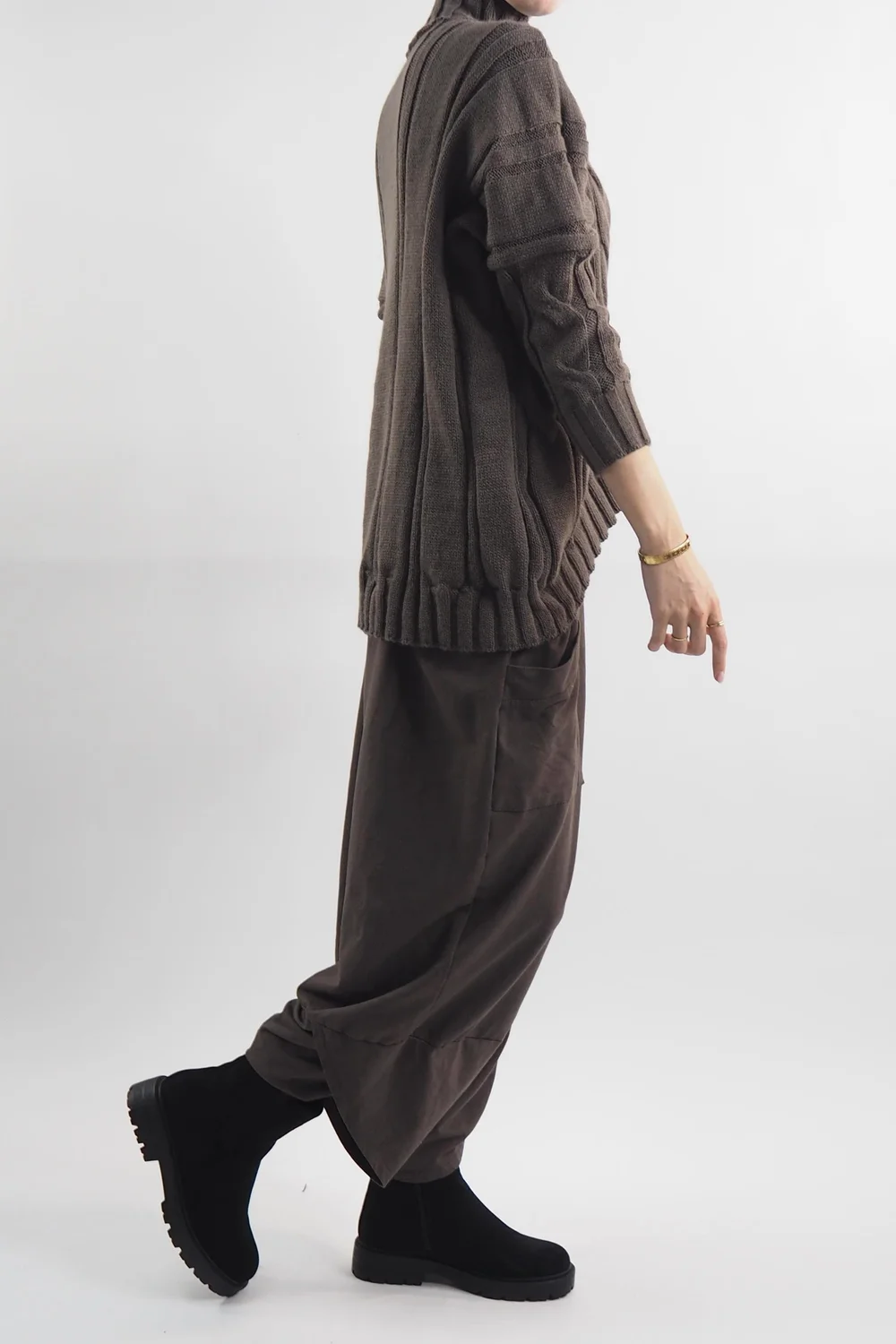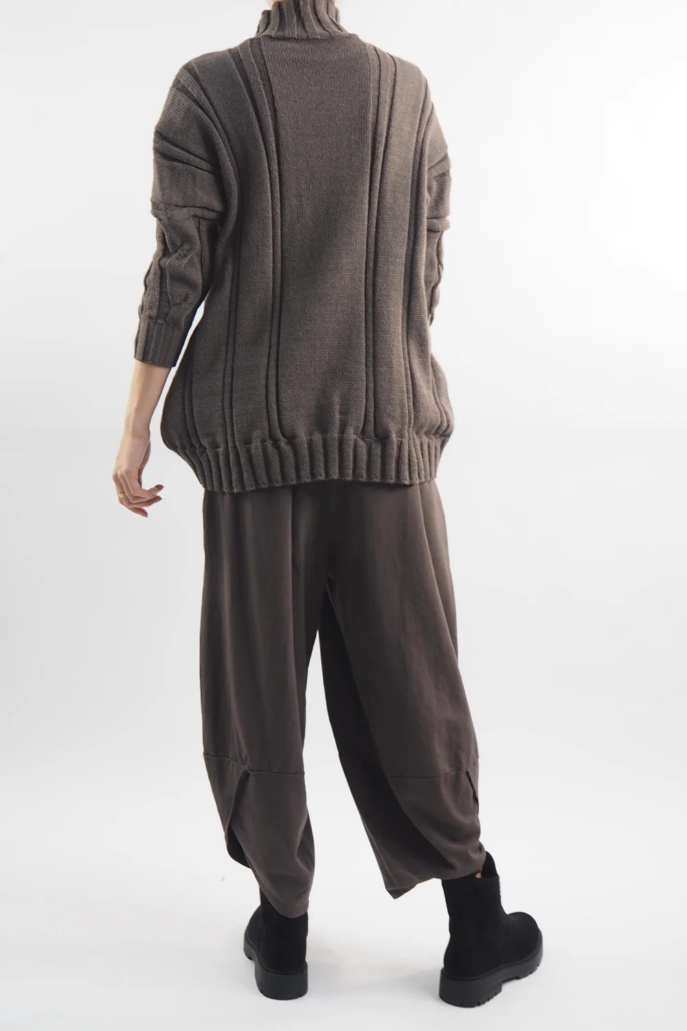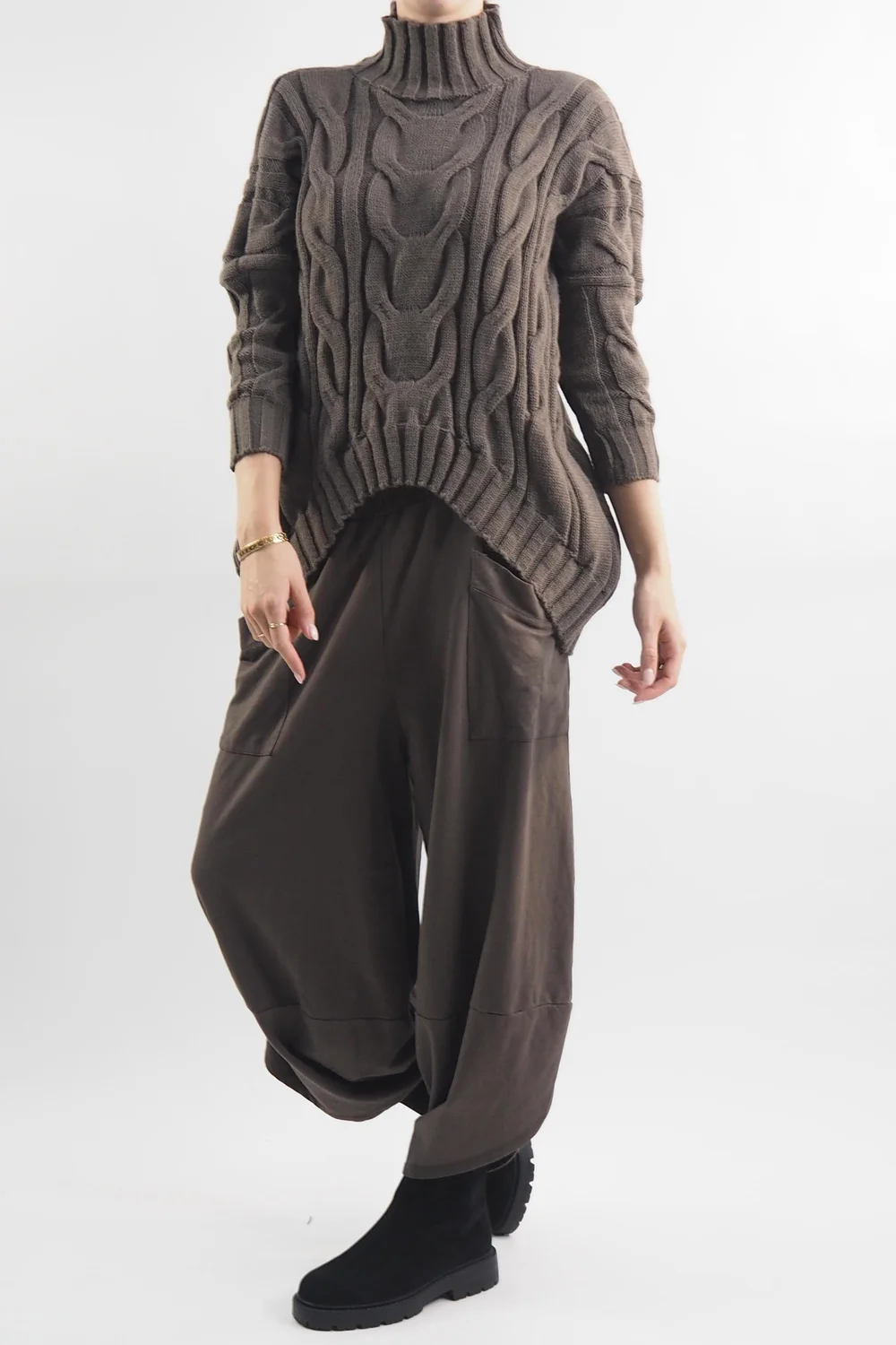 Get ready to embrace the cosiness of autumn and winter with a touch of timeless elegance: the Made in Italy Turtle Cable Guy Knit in Earth, brown tone is the perfect piece, it boasts a luxurious turtle neck, keeping you snug while adding an air of sophistication to your ensemble. Style with a pair of our classic Lagenlook cocoon pants. Whether you’re strolling through falling leaves in the park or sipping cocoa by the fireplace, this jumper will be your ultimate companion for a chic and snug season. Elevate your cold-weather wardrobe with this must-have piece.